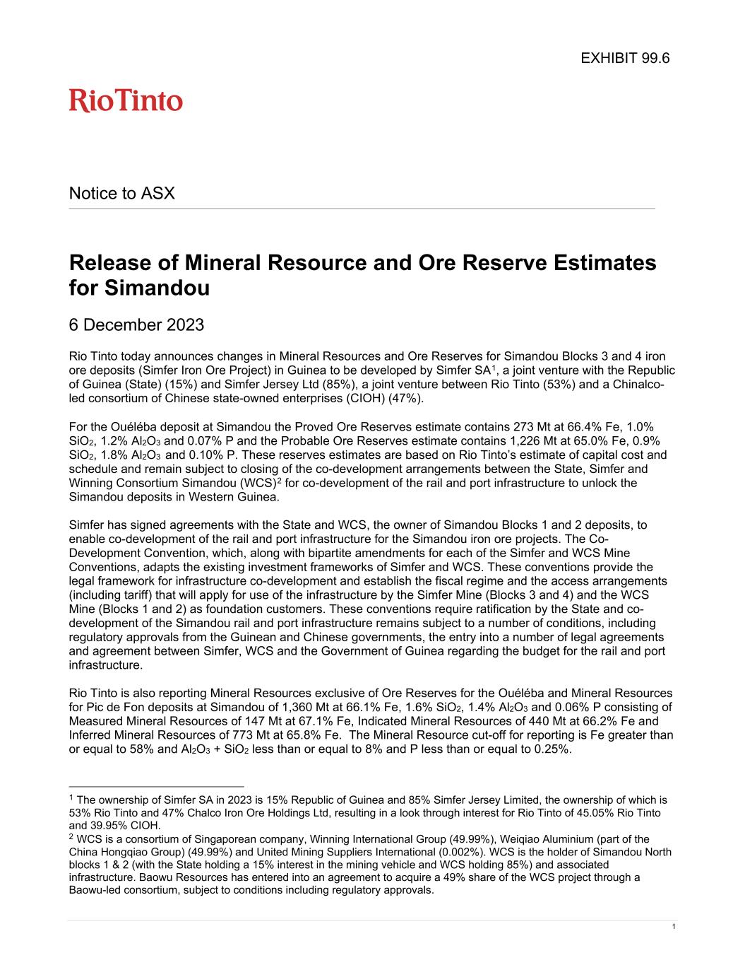 1 Notice to ASX Release of Mineral Resource and Ore Reserve Estimates for Simandou 6 December 2023 Rio Tinto today announces changes in Mineral Resources and Ore Reserves for Simandou Blocks 3 and 4 iron ore deposits (Simfer Iron Ore Project) in Guinea to be developed by Simfer SA1, a joint venture with the Republic of Guinea (State) (15%) and Simfer Jersey Ltd (85%), a joint venture between Rio Tinto (53%) and a Chinalco- led consortium of Chinese state-owned enterprises (CIOH) (47%). For the Ouéléba deposit at Simandou the Proved Ore Reserves estimate contains 273 Mt at 66.4% Fe, 1.0% SiO2, 1.2% Al2O3 and 0.07% P and the Probable Ore Reserves estimate contains 1,226 Mt at 65.0% Fe, 0.9% SiO2, 1.8% Al2O3 and 0.10% P. These reserves estimates are based on Rio Tinto’s estimate of capital cost and schedule and remain subject to closing of the co-development arrangements between the State, Simfer and Winning Consortium Simandou (WCS)2 for co-development of the rail and port infrastructure to unlock the Simandou deposits in Western Guinea. Simfer has signed agreements with the State and WCS, the owner of Simandou Blocks 1 and 2 deposits, to enable co-development of the rail and port infrastructure for the Simandou iron ore projects. The Co- Development Convention, which, along with bipartite amendments for each of the Simfer and WCS Mine Conventions, adapts the existing investment frameworks of Simfer and WCS. These conventions provide the legal framework for infrastructure co-development and establish the fiscal regime and the access arrangements (including tariff) that will apply for use of the infrastructure by the Simfer Mine (Blocks 3 and 4) and the WCS Mine (Blocks 1 and 2) as foundation customers. These conventions require ratification by the State and co- development of the Simandou rail and port infrastructure remains subject to a number of conditions, including regulatory approvals from the Guinean and Chinese governments, the entry into a number of legal agreements and agreement between Simfer, WCS and the Government of Guinea regarding the budget for the rail and port infrastructure. Rio Tinto is also reporting Mineral Resources exclusive of Ore Reserves for the Ouéléba and Mineral Resources for Pic de Fon deposits at Simandou of 1,360 Mt at 66.1% Fe, 1.6% SiO2, 1.4% Al2O3 and 0.06% P consisting of Measured Mineral Resources of 147 Mt at 67.1% Fe, Indicated Mineral Resources of 440 Mt at 66.2% Fe and Inferred Mineral Resources of 773 Mt at 65.8% Fe. The Mineral Resource cut-off for reporting is Fe greater than or equal to 58% and Al2O3 + SiO2 less than or equal to 8% and P less than or equal to 0.25%. 1 The ownership of Simfer SA in 2023 is 15% Republic of Guinea and 85% Simfer Jersey Limited, the ownership of which is 53% Rio Tinto and 47% Chalco Iron Ore Holdings Ltd, resulting in a look through interest for Rio Tinto of 45.05% Rio Tinto and 39.95% CIOH. 2 WCS is a consortium of Singaporean company, Winning International Group (49.99%), Weiqiao Aluminium (part of the China Hongqiao Group) (49.99%) and United Mining Suppliers International (0.002%). WCS is the holder of Simandou North blocks 1 & 2 (with the State holding a 15% interest in the mining vehicle and WCS holding 85%) and associated infrastructure. Baowu Resources has entered into an agreement to acquire a 49% share of the WCS project through a Baowu-led consortium, subject to conditions including regulatory approvals. EXHIBIT 99.6