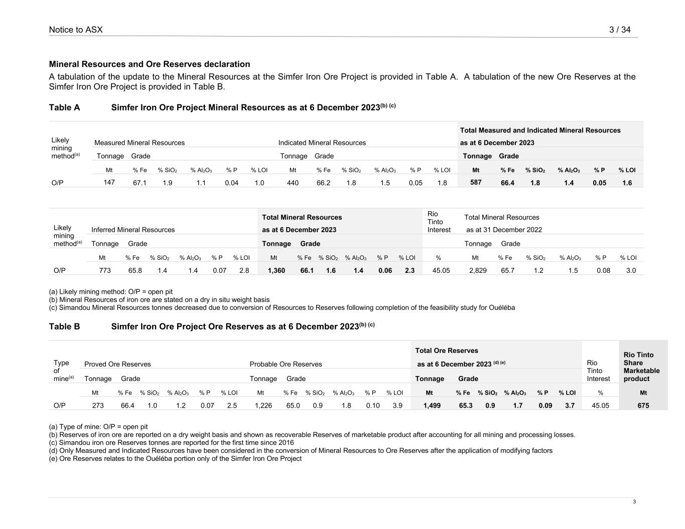 Notice to ASX 3 / 34 3 Mineral Resources and Ore Reserves declaration A tabulation of the update to the Mineral Resources at the Simfer Iron Ore Project is provided in Table A. A tabulation of the new Ore Reserves at the Simfer Iron Ore Project is provided in Table B. Table A Simfer Iron Ore Project Mineral Resources as at 6 December 2023(b) (c) Likely mining method(a) Total Measured and Indicated Mineral Resources Measured Mineral Resources Indicated Mineral Resources as at 6 December 2023 Tonnage Grade Tonnage Grade Tonnage Grade Mt % Fe % SiO2 % Al2O3 % P % LOI Mt % Fe % SiO2 % Al2O3 % P % LOI Mt % Fe % SiO2 % Al2O3 % P % LOI O/P 147 67.1 1.9 1.1 0.04 1.0 440 66.2 1.8 1.5 0.05 1.8 587 66.4 1.8 1.4 0.05 1.6 Likely mining method(a) Total Mineral Resources Rio Tinto Interest Total Mineral Resources Inferred Mineral Resources as at 6 December 2023 as at 31 December 2022 Tonnage Grade Tonnage Grade Tonnage Grade Mt % Fe % SiO2 % Al2O3 % P % LOI Mt % Fe % SiO2 % Al2O3 % P % LOI % Mt % Fe % SiO2 % Al2O3 % P % LOI O/P 773 65.8 1.4 1.4 0.07 2.8 1,360 66.1 1.6 1.4 0.06 2.3 45.05 2,829 65.7 1.2 1.5 0.08 3.0 (a) Likely mining method: O/P = open pit (b) Mineral Resources of iron ore are stated on a dry in situ weight basis (c) Simandou Mineral Resources tonnes decreased due to conversion of Resources to Reserves following completion of the feasibility study for Ouéléba Table B Simfer Iron Ore Project Ore Reserves as at 6 December 2023(b) (c) Type of mine(a) Total Ore Reserves Rio Tinto Interest Rio Tinto Share Marketable product Proved Ore Reserves Probable Ore Reserves as at 6 December 2023 (d) (e) Tonnage Grade Tonnage Grade Tonnage Grade Mt % Fe % SiO2 % Al2O3 % P % LOI Mt % Fe % SiO2 % Al2O3 % P % LOI Mt % Fe % SiO2 % Al2O3 % P % LOI % Mt O/P 273 66.4 1.0 1.2 0.07 2.5 1,226 65.0 0.9 1.8 0.10 3.9 1,499 65.3 0.9 1.7 0.09 3.7 45.05 675 (a) Type of mine: O/P = open pit (b) Reserves of iron ore are reported on a dry weight basis and shown as recoverable Reserves of marketable product after accounting for all mining and processing losses. (c) Simandou iron ore Reserves tonnes are reported for the first time since 2016 (d) Only Measured and Indicated Resources have been considered in the conversion of Mineral Resources to Ore Reserves after the application of modifying factors (e) Ore Reserves relates to the Ouéléba portion only of the Simfer Iron Ore Project