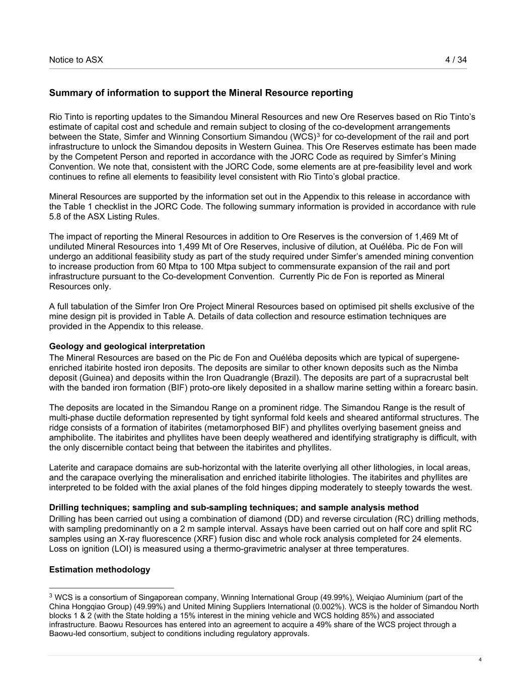 Notice to ASX 4 / 34 4 Summary of information to support the Mineral Resource reporting Rio Tinto is reporting updates to the Simandou Mineral Resources and new Ore Reserves based on Rio Tinto’s estimate of capital cost and schedule and remain subject to closing of the co-development arrangements between the State, Simfer and Winning Consortium Simandou (WCS)3 for co-development of the rail and port infrastructure to unlock the Simandou deposits in Western Guinea. This Ore Reserves estimate has been made by the Competent Person and reported in accordance with the JORC Code as required by Simfer’s Mining Convention. We note that, consistent with the JORC Code, some elements are at pre-feasibility level and work continues to refine all elements to feasibility level consistent with Rio Tinto’s global practice. Mineral Resources are supported by the information set out in the Appendix to this release in accordance with the Table 1 checklist in the JORC Code. The following summary information is provided in accordance with rule 5.8 of the ASX Listing Rules. The impact of reporting the Mineral Resources in addition to Ore Reserves is the conversion of 1,469 Mt of undiluted Mineral Resources into 1,499 Mt of Ore Reserves, inclusive of dilution, at Ouéléba. Pic de Fon will undergo an additional feasibility study as part of the study required under Simfer’s amended mining convention to increase production from 60 Mtpa to 100 Mtpa subject to commensurate expansion of the rail and port infrastructure pursuant to the Co-development Convention. Currently Pic de Fon is reported as Mineral Resources only. A full tabulation of the Simfer Iron Ore Project Mineral Resources based on optimised pit shells exclusive of the mine design pit is provided in Table A. Details of data collection and resource estimation techniques are provided in the Appendix to this release. Geology and geological interpretation The Mineral Resources are based on the Pic de Fon and Ouéléba deposits which are typical of supergene- enriched itabirite hosted iron deposits. The deposits are similar to other known deposits such as the Nimba deposit (Guinea) and deposits within the Iron Quadrangle (Brazil). The deposits are part of a supracrustal belt with the banded iron formation (BIF) proto-ore likely deposited in a shallow marine setting within a forearc basin. The deposits are located in the Simandou Range on a prominent ridge. The Simandou Range is the result of multi-phase ductile deformation represented by tight synformal fold keels and sheared antiformal structures. The ridge consists of a formation of itabirites (metamorphosed BIF) and phyllites overlying basement gneiss and amphibolite. The itabirites and phyllites have been deeply weathered and identifying stratigraphy is difficult, with the only discernible contact being that between the itabirites and phyllites. Laterite and carapace domains are sub-horizontal with the laterite overlying all other lithologies, in local areas, and the carapace overlying the mineralisation and enriched itabirite lithologies. The itabirites and phyllites are interpreted to be folded with the axial planes of the fold hinges dipping moderately to steeply towards the west. Drilling techniques; sampling and sub-sampling techniques; and sample analysis method Drilling has been carried out using a combination of diamond (DD) and reverse circulation (RC) drilling methods, with sampling predominantly on a 2 m sample interval. Assays have been carried out on half core and split RC samples using an X-ray fluorescence (XRF) fusion disc and whole rock analysis completed for 24 elements. Loss on ignition (LOI) is measured using a thermo-gravimetric analyser at three temperatures. Estimation methodology 3 WCS is a consortium of Singaporean company, Winning International Group (49.99%), Weiqiao Aluminium (part of the China Hongqiao Group) (49.99%) and United Mining Suppliers International (0.002%). WCS is the holder of Simandou North blocks 1 & 2 (with the State holding a 15% interest in the mining vehicle and WCS holding 85%) and associated infrastructure. Baowu Resources has entered into an agreement to acquire a 49% share of the WCS project through a Baowu-led consortium, subject to conditions including regulatory approvals.