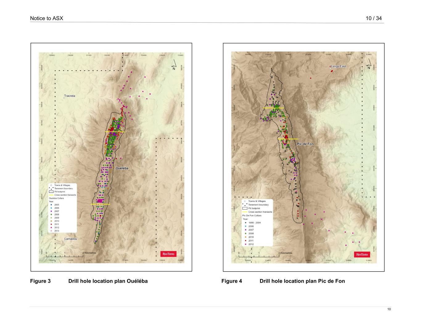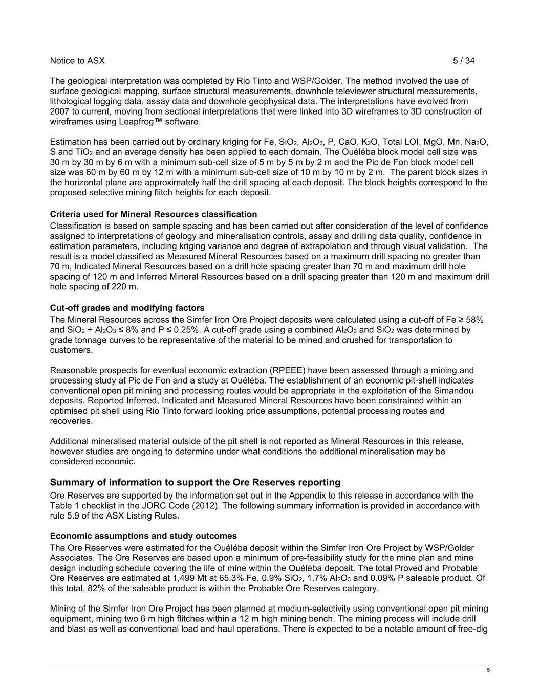 Notice to ASX 5 / 34 5 The geological interpretation was completed by Rio Tinto and WSP/Golder. The method involved the use of surface geological mapping, surface structural measurements, downhole televiewer structural measurements, lithological logging data, assay data and downhole geophysical data. The interpretations have evolved from 2007 to current, moving from sectional interpretations that were linked into 3D wireframes to 3D construction of wireframes using Leapfrog™ software. Estimation has been carried out by ordinary kriging for Fe, SiO2, Al2O3, P, CaO, K2O, Total LOI, MgO, Mn, Na2O, S and TiO2 and an average density has been applied to each domain. The Ouéléba block model cell size was 30 m by 30 m by 6 m with a minimum sub-cell size of 5 m by 5 m by 2 m and the Pic de Fon block model cell size was 60 m by 60 m by 12 m with a minimum sub-cell size of 10 m by 10 m by 2 m. The parent block sizes in the horizontal plane are approximately half the drill spacing at each deposit. The block heights correspond to the proposed selective mining flitch heights for each deposit. Criteria used for Mineral Resources classification Classification is based on sample spacing and has been carried out after consideration of the level of confidence assigned to interpretations of geology and mineralisation controls, assay and drilling data quality, confidence in estimation parameters, including kriging variance and degree of extrapolation and through visual validation. The result is a model classified as Measured Mineral Resources based on a maximum drill spacing no greater than 70 m, Indicated Mineral Resources based on a drill hole spacing greater than 70 m and maximum drill hole spacing of 120 m and Inferred Mineral Resources based on a drill spacing greater than 120 m and maximum drill hole spacing of 220 m. Cut-off grades and modifying factors The Mineral Resources across the Simfer Iron Ore Project deposits were calculated using a cut-off of Fe ≥ 58% and SiO2 + Al2O3 ≤ 8% and P ≤ 0.25%. A cut-off grade using a combined Al2O3 and SiO2 was determined by grade tonnage curves to be representative of the material to be mined and crushed for transportation to customers. Reasonable prospects for eventual economic extraction (RPEEE) have been assessed through a mining and processing study at Pic de Fon and a study at Ouéléba. The establishment of an economic pit-shell indicates conventional open pit mining and processing routes would be appropriate in the exploitation of the Simandou deposits. Reported Inferred, Indicated and Measured Mineral Resources have been constrained within an optimised pit shell using Rio Tinto forward looking price assumptions, potential processing routes and recoveries. Additional mineralised material outside of the pit shell is not reported as Mineral Resources in this release, however studies are ongoing to determine under what conditions the additional mineralisation may be considered economic. Summary of information to support the Ore Reserves reporting Ore Reserves are supported by the information set out in the Appendix to this release in accordance with the Table 1 checklist in the JORC Code (2012). The following summary information is provided in accordance with rule 5.9 of the ASX Listing Rules. Economic assumptions and study outcomes The Ore Reserves were estimated for the Ouéléba deposit within the Simfer Iron Ore Project by WSP/Golder Associates. The Ore Reserves are based upon a minimum of pre-feasibility study for the mine plan and mine design including schedule covering the life of mine within the Ouéléba deposit. The total Proved and Probable Ore Reserves are estimated at 1,499 Mt at 65.3% Fe, 0.9% SiO2, 1.7% Al2O3 and 0.09% P saleable product. Of this total, 82% of the saleable product is within the Probable Ore Reserves category. Mining of the Simfer Iron Ore Project has been planned at medium-selectivity using conventional open pit mining equipment, mining two 6 m high flitches within a 12 m high mining bench. The mining process will include drill and blast as well as conventional load and haul operations. There is expected to be a notable amount of free-dig