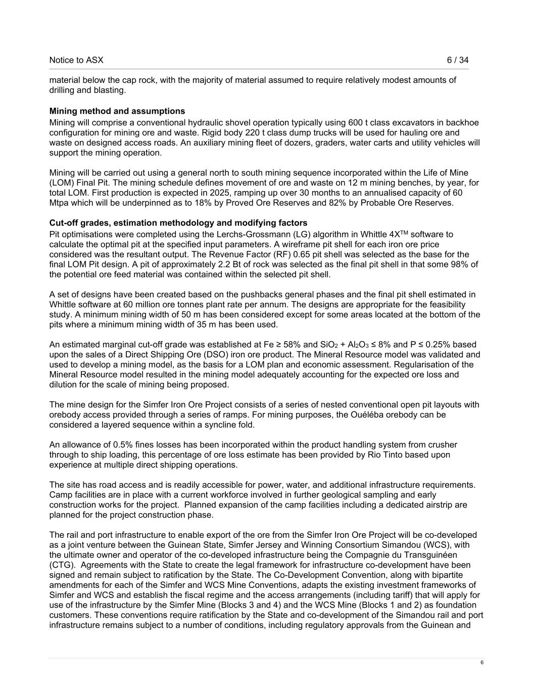 Notice to ASX 6 / 34 6 material below the cap rock, with the majority of material assumed to require relatively modest amounts of drilling and blasting. Mining method and assumptions Mining will comprise a conventional hydraulic shovel operation typically using 600 t class excavators in backhoe configuration for mining ore and waste. Rigid body 220 t class dump trucks will be used for hauling ore and waste on designed access roads. An auxiliary mining fleet of dozers, graders, water carts and utility vehicles will support the mining operation. Mining will be carried out using a general north to south mining sequence incorporated within the Life of Mine (LOM) Final Pit. The mining schedule defines movement of ore and waste on 12 m mining benches, by year, for total LOM. First production is expected in 2025, ramping up over 30 months to an annualised capacity of 60 Mtpa which will be underpinned as to 18% by Proved Ore Reserves and 82% by Probable Ore Reserves. Cut-off grades, estimation methodology and modifying factors Pit optimisations were completed using the Lerchs-Grossmann (LG) algorithm in Whittle 4XTM software to calculate the optimal pit at the specified input parameters. A wireframe pit shell for each iron ore price considered was the resultant output. The Revenue Factor (RF) 0.65 pit shell was selected as the base for the final LOM Pit design. A pit of approximately 2.2 Bt of rock was selected as the final pit shell in that some 98% of the potential ore feed material was contained within the selected pit shell. A set of designs have been created based on the pushbacks general phases and the final pit shell estimated in Whittle software at 60 million ore tonnes plant rate per annum. The designs are appropriate for the feasibility study. A minimum mining width of 50 m has been considered except for some areas located at the bottom of the pits where a minimum mining width of 35 m has been used. An estimated marginal cut-off grade was established at Fe ≥ 58% and SiO2 + Al2O3 ≤ 8% and P ≤ 0.25% based upon the sales of a Direct Shipping Ore (DSO) iron ore product. The Mineral Resource model was validated and used to develop a mining model, as the basis for a LOM plan and economic assessment. Regularisation of the Mineral Resource model resulted in the mining model adequately accounting for the expected ore loss and dilution for the scale of mining being proposed. The mine design for the Simfer Iron Ore Project consists of a series of nested conventional open pit layouts with orebody access provided through a series of ramps. For mining purposes, the Ouéléba orebody can be considered a layered sequence within a syncline fold. An allowance of 0.5% fines losses has been incorporated within the product handling system from crusher through to ship loading, this percentage of ore loss estimate has been provided by Rio Tinto based upon experience at multiple direct shipping operations. The site has road access and is readily accessible for power, water, and additional infrastructure requirements. Camp facilities are in place with a current workforce involved in further geological sampling and early construction works for the project. Planned expansion of the camp facilities including a dedicated airstrip are planned for the project construction phase. The rail and port infrastructure to enable export of the ore from the Simfer Iron Ore Project will be co-developed as a joint venture between the Guinean State, Simfer Jersey and Winning Consortium Simandou (WCS), with the ultimate owner and operator of the co-developed infrastructure being the Compagnie du Transguinéen (CTG). Agreements with the State to create the legal framework for infrastructure co-development have been signed and remain subject to ratification by the State. The Co-Development Convention, along with bipartite amendments for each of the Simfer and WCS Mine Conventions, adapts the existing investment frameworks of Simfer and WCS and establish the fiscal regime and the access arrangements (including tariff) that will apply for use of the infrastructure by the Simfer Mine (Blocks 3 and 4) and the WCS Mine (Blocks 1 and 2) as foundation customers. These conventions require ratification by the State and co-development of the Simandou rail and port infrastructure remains subject to a number of conditions, including regulatory approvals from the Guinean and