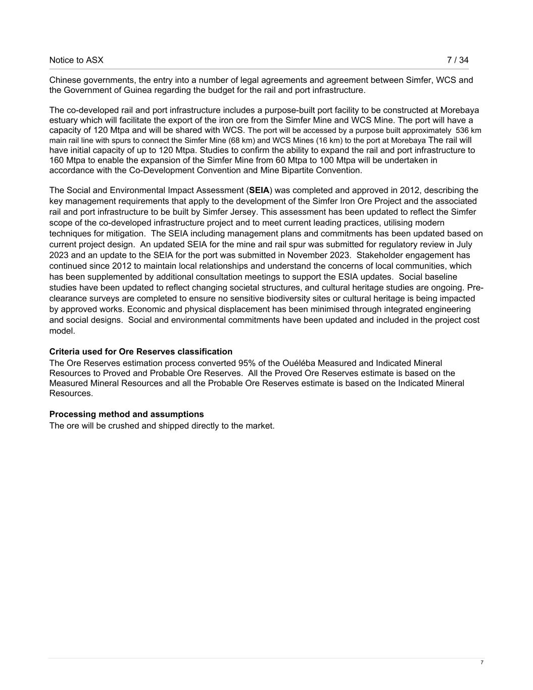 Notice to ASX 7 / 34 7 Chinese governments, the entry into a number of legal agreements and agreement between Simfer, WCS and the Government of Guinea regarding the budget for the rail and port infrastructure. The co-developed rail and port infrastructure includes a purpose-built port facility to be constructed at Morebaya estuary which will facilitate the export of the iron ore from the Simfer Mine and WCS Mine. The port will have a capacity of 120 Mtpa and will be shared with WCS. The port will be accessed by a purpose built approximately 536 km main rail line with spurs to connect the Simfer Mine (68 km) and WCS Mines (16 km) to the port at Morebaya The rail will have initial capacity of up to 120 Mtpa. Studies to confirm the ability to expand the rail and port infrastructure to 160 Mtpa to enable the expansion of the Simfer Mine from 60 Mtpa to 100 Mtpa will be undertaken in accordance with the Co-Development Convention and Mine Bipartite Convention. The Social and Environmental Impact Assessment (SEIA) was completed and approved in 2012, describing the key management requirements that apply to the development of the Simfer Iron Ore Project and the associated rail and port infrastructure to be built by Simfer Jersey. This assessment has been updated to reflect the Simfer scope of the co-developed infrastructure project and to meet current leading practices, utilising modern techniques for mitigation. The SEIA including management plans and commitments has been updated based on current project design. An updated SEIA for the mine and rail spur was submitted for regulatory review in July 2023 and an update to the SEIA for the port was submitted in November 2023. Stakeholder engagement has continued since 2012 to maintain local relationships and understand the concerns of local communities, which has been supplemented by additional consultation meetings to support the ESIA updates. Social baseline studies have been updated to reflect changing societal structures, and cultural heritage studies are ongoing. Pre- clearance surveys are completed to ensure no sensitive biodiversity sites or cultural heritage is being impacted by approved works. Economic and physical displacement has been minimised through integrated engineering and social designs. Social and environmental commitments have been updated and included in the project cost model. Criteria used for Ore Reserves classification The Ore Reserves estimation process converted 95% of the Ouéléba Measured and Indicated Mineral Resources to Proved and Probable Ore Reserves. All the Proved Ore Reserves estimate is based on the Measured Mineral Resources and all the Probable Ore Reserves estimate is based on the Indicated Mineral Resources. Processing method and assumptions The ore will be crushed and shipped directly to the market.