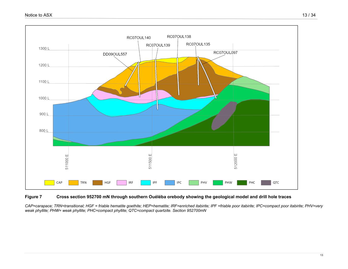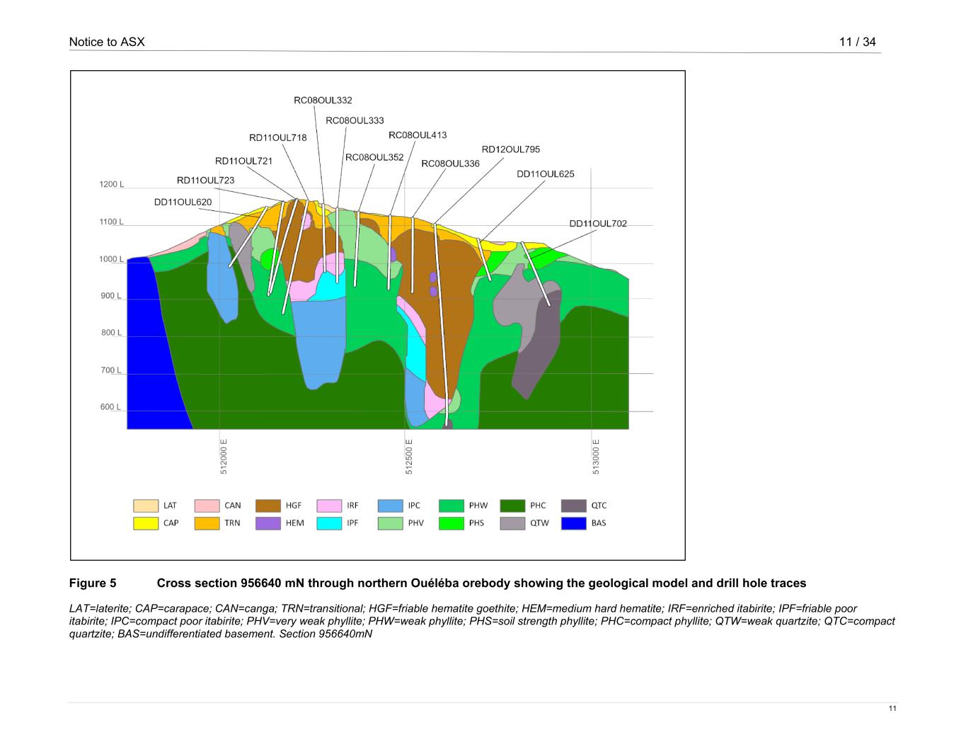 Notice to ASX 11 / 34 11 Figure 5 Cross section 956640 mN through northern Ouéléba orebody showing the geological model and drill hole traces LAT=laterite; CAP=carapace; CAN=canga; TRN=transitional; HGF=friable hematite goethite; HEM=medium hard hematite; IRF=enriched itabirite; IPF=friable poor itabirite; IPC=compact poor itabirite; PHV=very weak phyllite; PHW=weak phyllite; PHS=soil strength phyllite; PHC=compact phyllite; QTW=weak quartzite; QTC=compact quartzite; BAS=undifferentiated basement. Section 956640mN