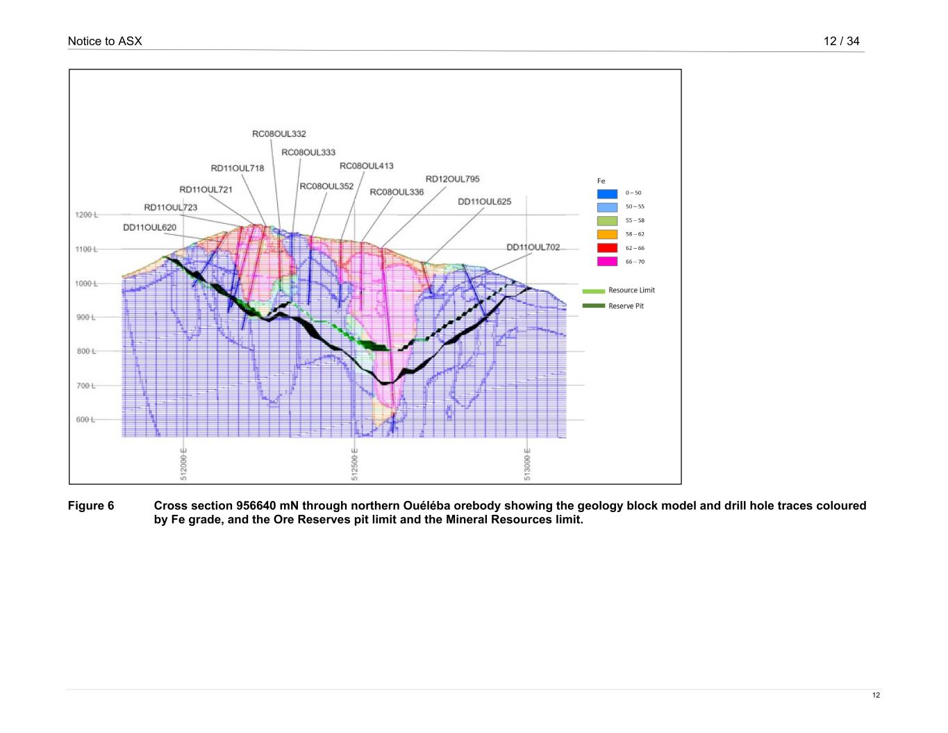 Notice to ASX 12 / 34 12 Figure 6 Cross section 956640 mN through northern Ouéléba orebody showing the geology block model and drill hole traces coloured by Fe grade, and the Ore Reserves pit limit and the Mineral Resources limit.