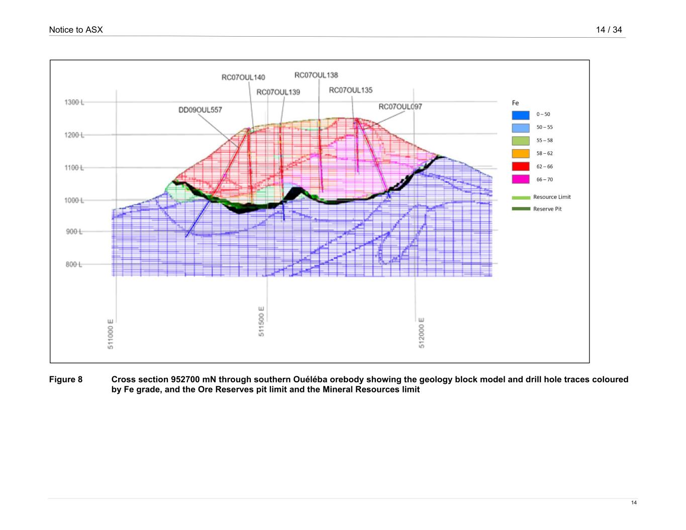 Notice to ASX 14 / 34 14 Figure 8 Cross section 952700 mN through southern Ouéléba orebody showing the geology block model and drill hole traces coloured by Fe grade, and the Ore Reserves pit limit and the Mineral Resources limit
