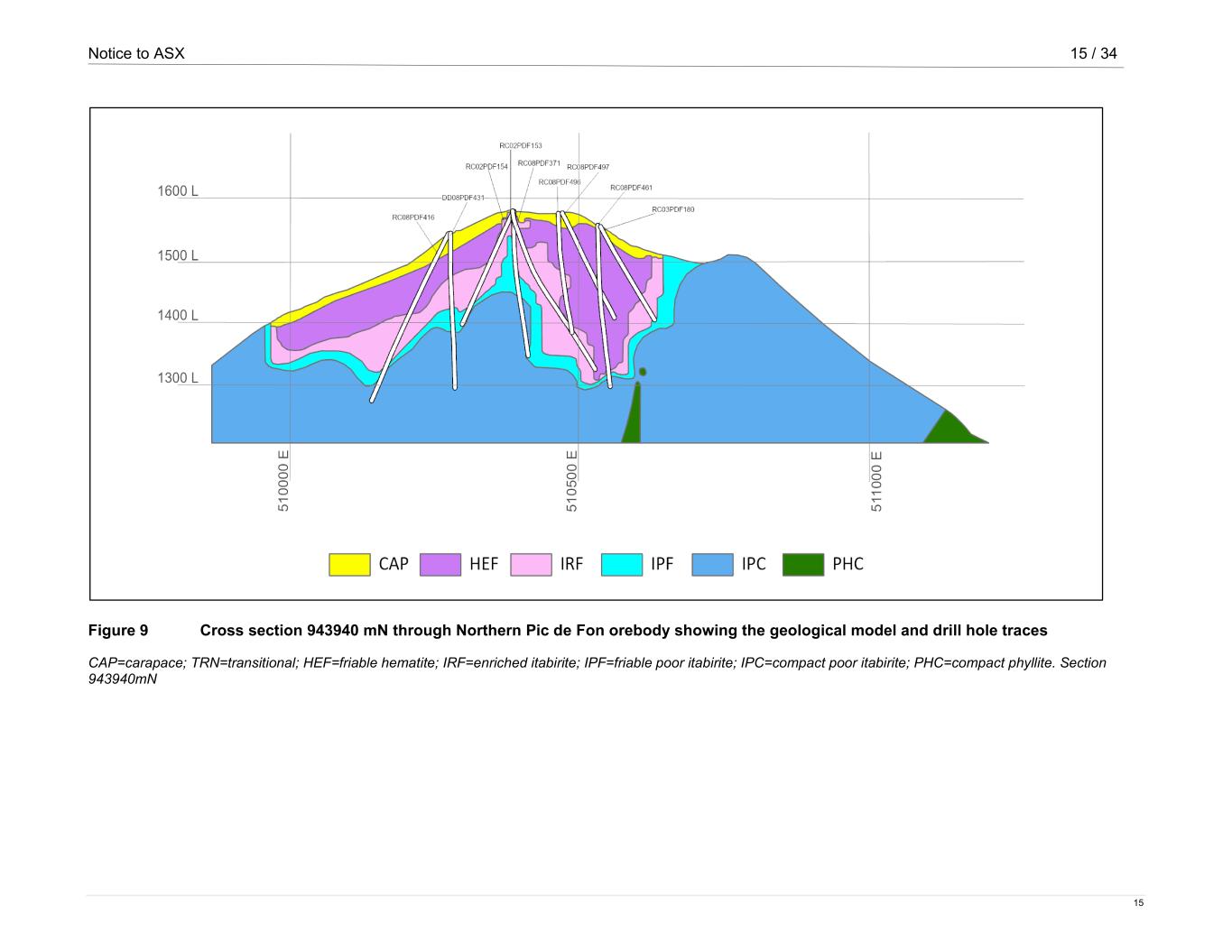 Notice to ASX 15 / 34 15 Figure 9 Cross section 943940 mN through Northern Pic de Fon orebody showing the geological model and drill hole traces CAP=carapace; TRN=transitional; HEF=friable hematite; IRF=enriched itabirite; IPF=friable poor itabirite; IPC=compact poor itabirite; PHC=compact phyllite. Section 943940mN