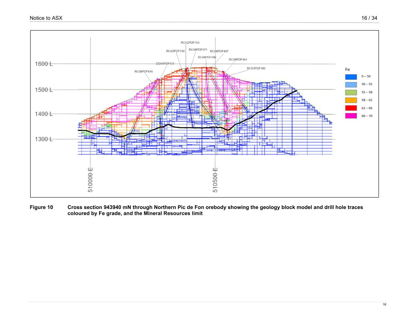 Notice to ASX 16 / 34 16 Figure 10 Cross section 943940 mN through Northern Pic de Fon orebody showing the geology block model and drill hole traces coloured by Fe grade, and the Mineral Resources limit