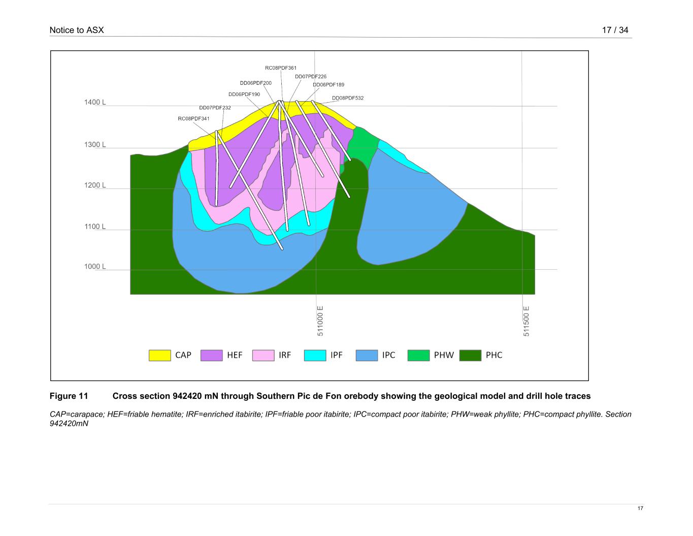 Notice to ASX 17 / 34 17 Figure 11 Cross section 942420 mN through Southern Pic de Fon orebody showing the geological model and drill hole traces CAP=carapace; HEF=friable hematite; IRF=enriched itabirite; IPF=friable poor itabirite; IPC=compact poor itabirite; PHW=weak phyllite; PHC=compact phyllite. Section 942420mN