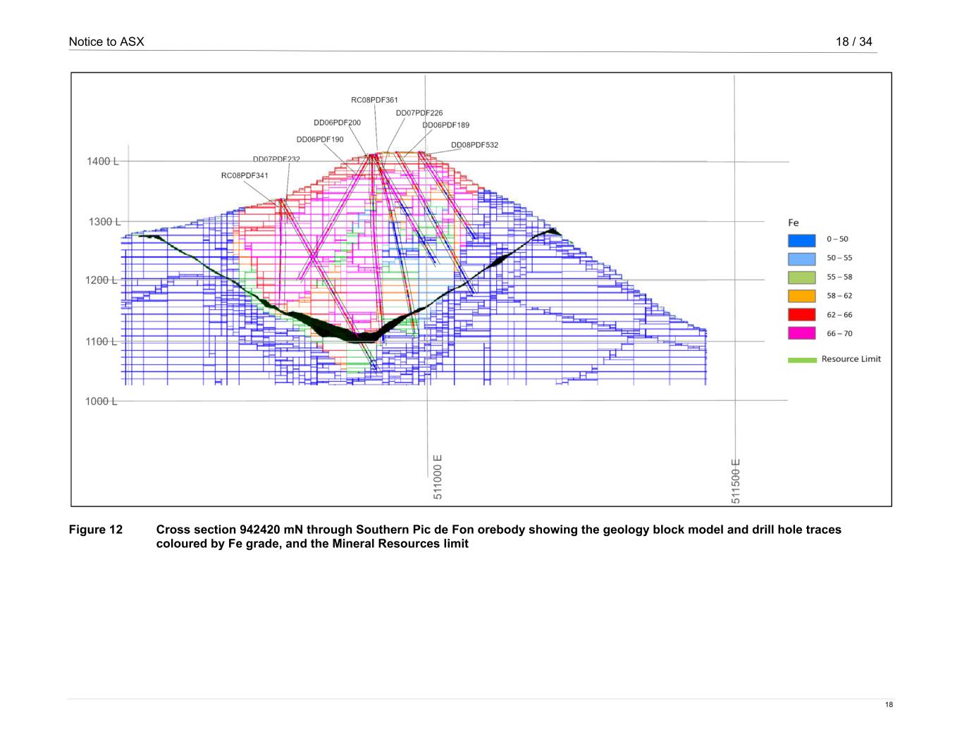 Notice to ASX 18 / 34 18 Figure 12 Cross section 942420 mN through Southern Pic de Fon orebody showing the geology block model and drill hole traces coloured by Fe grade, and the Mineral Resources limit