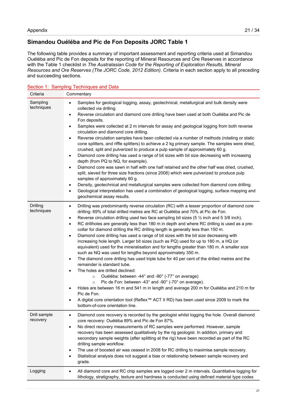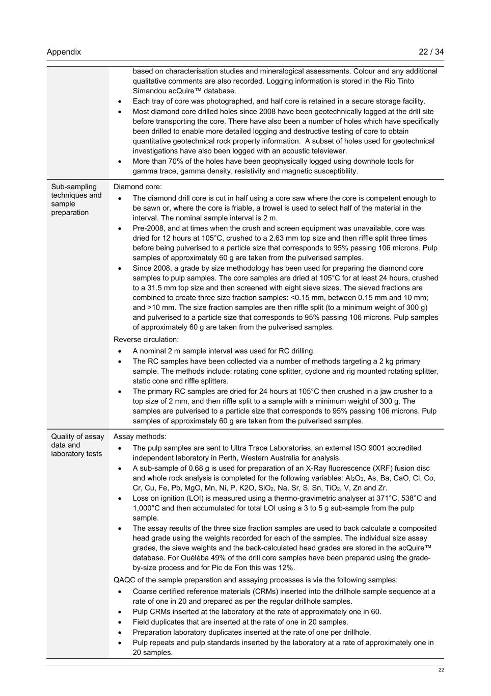 Appendix 22 / 34 22 based on characterisation studies and mineralogical assessments. Colour and any additional qualitative comments are also recorded. Logging information is stored in the Rio Tinto Simandou acQuire™ database. • Each tray of core was photographed, and half core is retained in a secure storage facility. • Most diamond core drilled holes since 2008 have been geotechnically logged at the drill site before transporting the core. There have also been a number of holes which have specifically been drilled to enable more detailed logging and destructive testing of core to obtain quantitative geotechnical rock property information. A subset of holes used for geotechnical investigations have also been logged with an acoustic televiewer. • More than 70% of the holes have been geophysically logged using downhole tools for gamma trace, gamma density, resistivity and magnetic susceptibility. Sub-sampling techniques and sample preparation Diamond core: • The diamond drill core is cut in half using a core saw where the core is competent enough to be sawn or, where the core is friable, a trowel is used to select half of the material in the interval. The nominal sample interval is 2 m. • Pre-2008, and at times when the crush and screen equipment was unavailable, core was dried for 12 hours at 105°C, crushed to a 2.63 mm top size and then riffle split three times before being pulverised to a particle size that corresponds to 95% passing 106 microns. Pulp samples of approximately 60 g are taken from the pulverised samples. • Since 2008, a grade by size methodology has been used for preparing the diamond core samples to pulp samples. The core samples are dried at 105°C for at least 24 hours, crushed to a 31.5 mm top size and then screened with eight sieve sizes. The sieved fractions are combined to create three size fraction samples: <0.15 mm, between 0.15 mm and 10 mm; and >10 mm. The size fraction samples are then riffle split (to a minimum weight of 300 g) and pulverised to a particle size that corresponds to 95% passing 106 microns. Pulp samples of approximately 60 g are taken from the pulverised samples. Reverse circulation: • A nominal 2 m sample interval was used for RC drilling. • The RC samples have been collected via a number of methods targeting a 2 kg primary sample. The methods include: rotating cone splitter, cyclone and rig mounted rotating splitter, static cone and riffle splitters. • The primary RC samples are dried for 24 hours at 105°C then crushed in a jaw crusher to a top size of 2 mm, and then riffle split to a sample with a minimum weight of 300 g. The samples are pulverised to a particle size that corresponds to 95% passing 106 microns. Pulp samples of approximately 60 g are taken from the pulverised samples. Quality of assay data and laboratory tests Assay methods: • The pulp samples are sent to Ultra Trace Laboratories, an external ISO 9001 accredited independent laboratory in Perth, Western Australia for analysis. • A sub-sample of 0.68 g is used for preparation of an X-Ray fluorescence (XRF) fusion disc and whole rock analysis is completed for the following variables: Al2O3, As, Ba, CaO, Cl, Co, Cr, Cu, Fe, Pb, MgO, Mn, Ni, P, K2O, SiO2, Na, Sr, S, Sn, TiO2, V, Zn and Zr. • Loss on ignition (LOI) is measured using a thermo-gravimetric analyser at 371°C, 538°C and 1,000°C and then accumulated for total LOI using a 3 to 5 g sub-sample from the pulp sample. • The assay results of the three size fraction samples are used to back calculate a composited head grade using the weights recorded for each of the samples. The individual size assay grades, the sieve weights and the back-calculated head grades are stored in the acQuire™ database. For Ouéléba 49% of the drill core samples have been prepared using the grade- by-size process and for Pic de Fon this was 12%. QAQC of the sample preparation and assaying processes is via the following samples: • Coarse certified reference materials (CRMs) inserted into the drillhole sample sequence at a rate of one in 20 and prepared as per the regular drillhole samples. • Pulp CRMs inserted at the laboratory at the rate of approximately one in 60. • Field duplicates that are inserted at the rate of one in 20 samples. • Preparation laboratory duplicates inserted at the rate of one per drillhole. • Pulp repeats and pulp standards inserted by the laboratory at a rate of approximately one in 20 samples.
