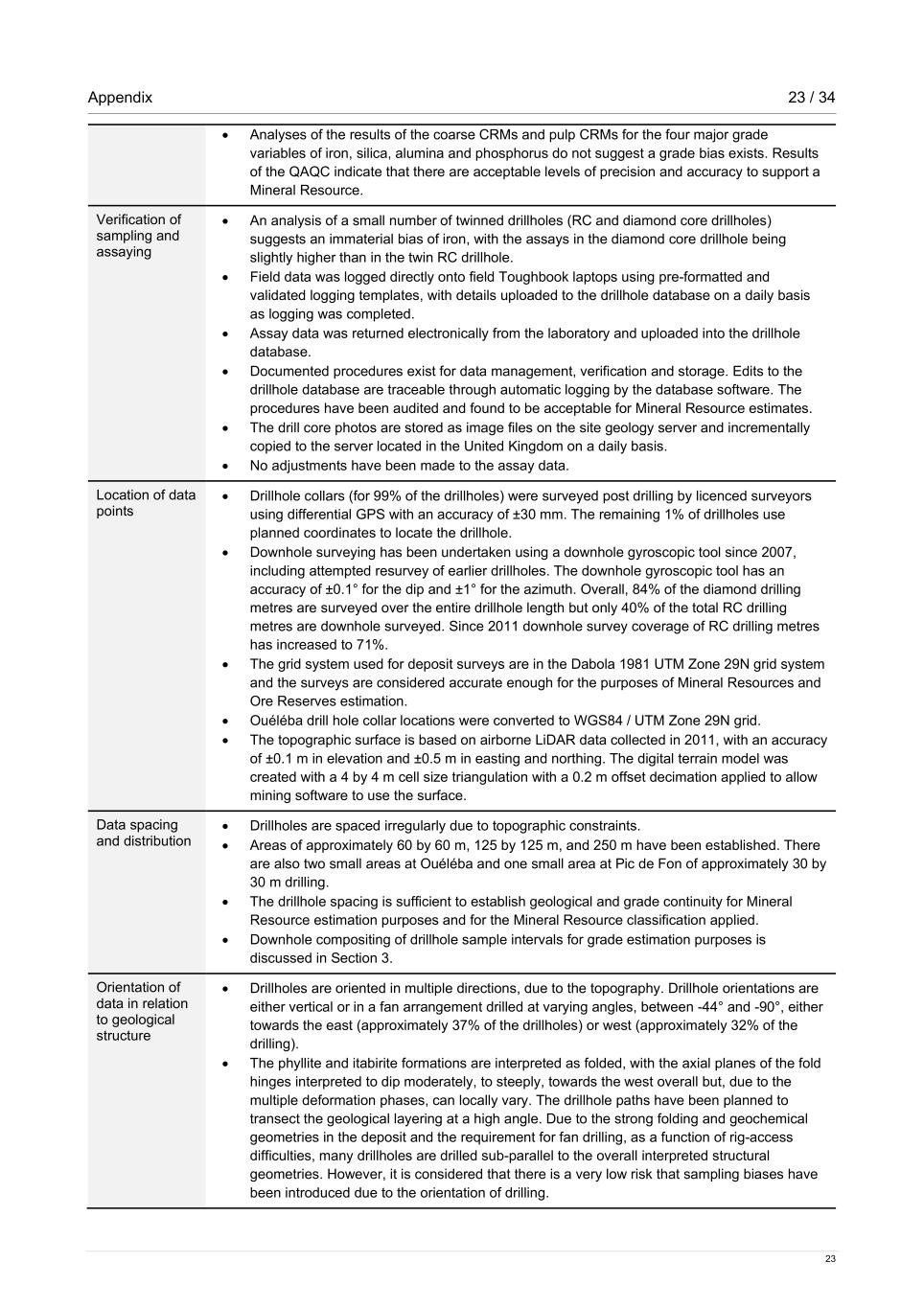 Appendix 23 / 34 23 • Analyses of the results of the coarse CRMs and pulp CRMs for the four major grade variables of iron, silica, alumina and phosphorus do not suggest a grade bias exists. Results of the QAQC indicate that there are acceptable levels of precision and accuracy to support a Mineral Resource. Verification of sampling and assaying • An analysis of a small number of twinned drillholes (RC and diamond core drillholes) suggests an immaterial bias of iron, with the assays in the diamond core drillhole being slightly higher than in the twin RC drillhole. • Field data was logged directly onto field Toughbook laptops using pre-formatted and validated logging templates, with details uploaded to the drillhole database on a daily basis as logging was completed. • Assay data was returned electronically from the laboratory and uploaded into the drillhole database. • Documented procedures exist for data management, verification and storage. Edits to the drillhole database are traceable through automatic logging by the database software. The procedures have been audited and found to be acceptable for Mineral Resource estimates. • The drill core photos are stored as image files on the site geology server and incrementally copied to the server located in the United Kingdom on a daily basis. • No adjustments have been made to the assay data. Location of data points • Drillhole collars (for 99% of the drillholes) were surveyed post drilling by licenced surveyors using differential GPS with an accuracy of ±30 mm. The remaining 1% of drillholes use planned coordinates to locate the drillhole. • Downhole surveying has been undertaken using a downhole gyroscopic tool since 2007, including attempted resurvey of earlier drillholes. The downhole gyroscopic tool has an accuracy of ±0.1° for the dip and ±1° for the azimuth. Overall, 84% of the diamond drilling metres are surveyed over the entire drillhole length but only 40% of the total RC drilling metres are downhole surveyed. Since 2011 downhole survey coverage of RC drilling metres has increased to 71%. • The grid system used for deposit surveys are in the Dabola 1981 UTM Zone 29N grid system and the surveys are considered accurate enough for the purposes of Mineral Resources and Ore Reserves estimation. • Ouéléba drill hole collar locations were converted to WGS84 / UTM Zone 29N grid. • The topographic surface is based on airborne LiDAR data collected in 2011, with an accuracy of ±0.1 m in elevation and ±0.5 m in easting and northing. The digital terrain model was created with a 4 by 4 m cell size triangulation with a 0.2 m offset decimation applied to allow mining software to use the surface. Data spacing and distribution • Drillholes are spaced irregularly due to topographic constraints. • Areas of approximately 60 by 60 m, 125 by 125 m, and 250 m have been established. There are also two small areas at Ouéléba and one small area at Pic de Fon of approximately 30 by 30 m drilling. • The drillhole spacing is sufficient to establish geological and grade continuity for Mineral Resource estimation purposes and for the Mineral Resource classification applied. • Downhole compositing of drillhole sample intervals for grade estimation purposes is discussed in Section 3. Orientation of data in relation to geological structure • Drillholes are oriented in multiple directions, due to the topography. Drillhole orientations are either vertical or in a fan arrangement drilled at varying angles, between -44° and -90°, either towards the east (approximately 37% of the drillholes) or west (approximately 32% of the drilling). • The phyllite and itabirite formations are interpreted as folded, with the axial planes of the fold hinges interpreted to dip moderately, to steeply, towards the west overall but, due to the multiple deformation phases, can locally vary. The drillhole paths have been planned to transect the geological layering at a high angle. Due to the strong folding and geochemical geometries in the deposit and the requirement for fan drilling, as a function of rig-access difficulties, many drillholes are drilled sub-parallel to the overall interpreted structural geometries. However, it is considered that there is a very low risk that sampling biases have been introduced due to the orientation of drilling.