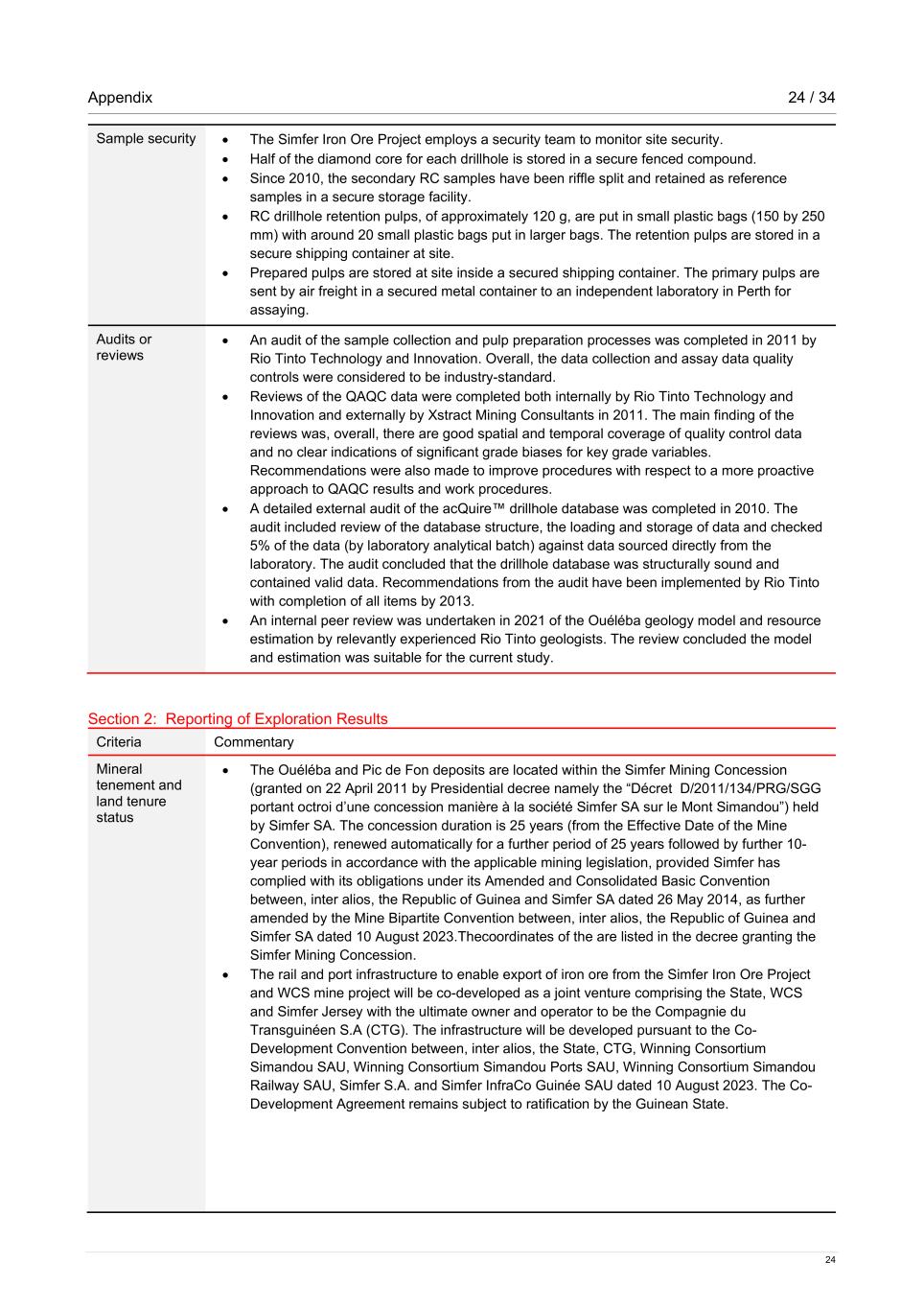 Appendix 24 / 34 24 Sample security • The Simfer Iron Ore Project employs a security team to monitor site security. • Half of the diamond core for each drillhole is stored in a secure fenced compound. • Since 2010, the secondary RC samples have been riffle split and retained as reference samples in a secure storage facility. • RC drillhole retention pulps, of approximately 120 g, are put in small plastic bags (150 by 250 mm) with around 20 small plastic bags put in larger bags. The retention pulps are stored in a secure shipping container at site. • Prepared pulps are stored at site inside a secured shipping container. The primary pulps are sent by air freight in a secured metal container to an independent laboratory in Perth for assaying. Audits or reviews • An audit of the sample collection and pulp preparation processes was completed in 2011 by Rio Tinto Technology and Innovation. Overall, the data collection and assay data quality controls were considered to be industry-standard. • Reviews of the QAQC data were completed both internally by Rio Tinto Technology and Innovation and externally by Xstract Mining Consultants in 2011. The main finding of the reviews was, overall, there are good spatial and temporal coverage of quality control data and no clear indications of significant grade biases for key grade variables. Recommendations were also made to improve procedures with respect to a more proactive approach to QAQC results and work procedures. • A detailed external audit of the acQuire™ drillhole database was completed in 2010. The audit included review of the database structure, the loading and storage of data and checked 5% of the data (by laboratory analytical batch) against data sourced directly from the laboratory. The audit concluded that the drillhole database was structurally sound and contained valid data. Recommendations from the audit have been implemented by Rio Tinto with completion of all items by 2013. • An internal peer review was undertaken in 2021 of the Ouéléba geology model and resource estimation by relevantly experienced Rio Tinto geologists. The review concluded the model and estimation was suitable for the current study. Section 2: Reporting of Exploration Results Criteria Commentary Mineral tenement and land tenure status • The Ouéléba and Pic de Fon deposits are located within the Simfer Mining Concession (granted on 22 April 2011 by Presidential decree namely the “Décret D/2011/134/PRG/SGG portant octroi d’une concession manière à la société Simfer SA sur le Mont Simandou”) held by Simfer SA. The concession duration is 25 years (from the Effective Date of the Mine Convention), renewed automatically for a further period of 25 years followed by further 10- year periods in accordance with the applicable mining legislation, provided Simfer has complied with its obligations under its Amended and Consolidated Basic Convention between, inter alios, the Republic of Guinea and Simfer SA dated 26 May 2014, as further amended by the Mine Bipartite Convention between, inter alios, the Republic of Guinea and Simfer SA dated 10 August 2023.Thecoordinates of the are listed in the decree granting the Simfer Mining Concession. • The rail and port infrastructure to enable export of iron ore from the Simfer Iron Ore Project and WCS mine project will be co-developed as a joint venture comprising the State, WCS and Simfer Jersey with the ultimate owner and operator to be the Compagnie du Transguinéen S.A (CTG). The infrastructure will be developed pursuant to the Co- Development Convention between, inter alios, the State, CTG, Winning Consortium Simandou SAU, Winning Consortium Simandou Ports SAU, Winning Consortium Simandou Railway SAU, Simfer S.A. and Simfer InfraCo Guinée SAU dated 10 August 2023. The Co- Development Agreement remains subject to ratification by the Guinean State.