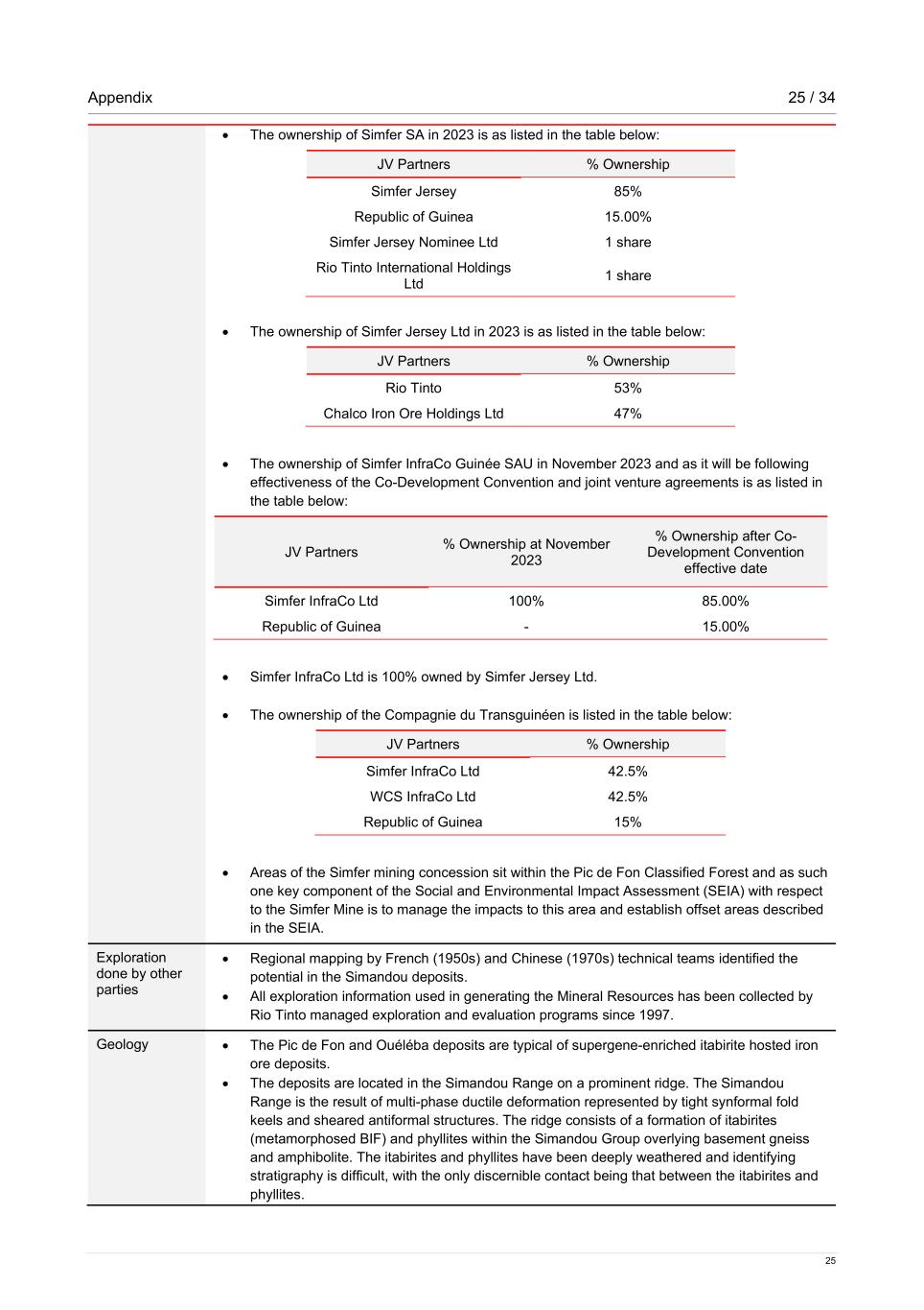 Appendix 25 / 34 25 • The ownership of Simfer SA in 2023 is as listed in the table below: JV Partners % Ownership Simfer Jersey 85% Republic of Guinea 15.00% Simfer Jersey Nominee Ltd 1 share Rio Tinto International Holdings Ltd 1 share • The ownership of Simfer Jersey Ltd in 2023 is as listed in the table below: JV Partners % Ownership Rio Tinto 53% Chalco Iron Ore Holdings Ltd 47% • The ownership of Simfer InfraCo Guinée SAU in November 2023 and as it will be following effectiveness of the Co-Development Convention and joint venture agreements is as listed in the table below: JV Partners % Ownership at November 2023 % Ownership after Co- Development Convention effective date Simfer InfraCo Ltd 100% 85.00% Republic of Guinea - 15.00% • Simfer InfraCo Ltd is 100% owned by Simfer Jersey Ltd. • The ownership of the Compagnie du Transguinéen is listed in the table below: JV Partners % Ownership Simfer InfraCo Ltd 42.5% WCS InfraCo Ltd 42.5% Republic of Guinea 15% • Areas of the Simfer mining concession sit within the Pic de Fon Classified Forest and as such one key component of the Social and Environmental Impact Assessment (SEIA) with respect to the Simfer Mine is to manage the impacts to this area and establish offset areas described in the SEIA. Exploration done by other parties • Regional mapping by French (1950s) and Chinese (1970s) technical teams identified the potential in the Simandou deposits. • All exploration information used in generating the Mineral Resources has been collected by Rio Tinto managed exploration and evaluation programs since 1997. Geology • The Pic de Fon and Ouéléba deposits are typical of supergene-enriched itabirite hosted iron ore deposits. • The deposits are located in the Simandou Range on a prominent ridge. The Simandou Range is the result of multi-phase ductile deformation represented by tight synformal fold keels and sheared antiformal structures. The ridge consists of a formation of itabirites (metamorphosed BIF) and phyllites within the Simandou Group overlying basement gneiss and amphibolite. The itabirites and phyllites have been deeply weathered and identifying stratigraphy is difficult, with the only discernible contact being that between the itabirites and phyllites.
