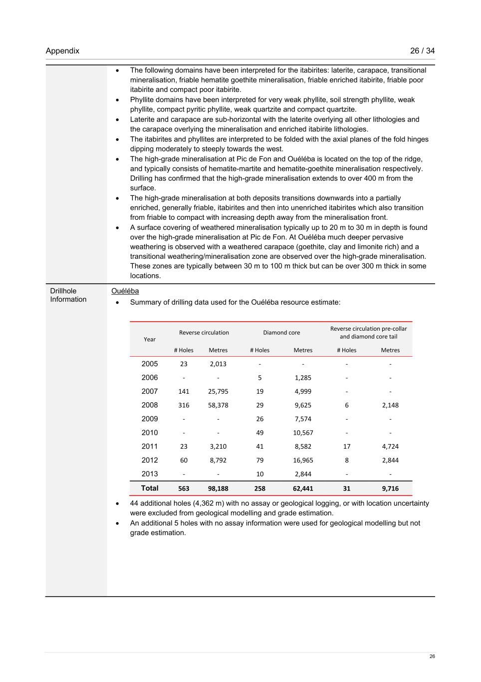 Appendix 26 / 34 26 • The following domains have been interpreted for the itabirites: laterite, carapace, transitional mineralisation, friable hematite goethite mineralisation, friable enriched itabirite, friable poor itabirite and compact poor itabirite. • Phyllite domains have been interpreted for very weak phyllite, soil strength phyllite, weak phyllite, compact pyritic phyllite, weak quartzite and compact quartzite. • Laterite and carapace are sub-horizontal with the laterite overlying all other lithologies and the carapace overlying the mineralisation and enriched itabirite lithologies. • The itabirites and phyllites are interpreted to be folded with the axial planes of the fold hinges dipping moderately to steeply towards the west. • The high-grade mineralisation at Pic de Fon and Ouéléba is located on the top of the ridge, and typically consists of hematite-martite and hematite-goethite mineralisation respectively. Drilling has confirmed that the high-grade mineralisation extends to over 400 m from the surface. • The high-grade mineralisation at both deposits transitions downwards into a partially enriched, generally friable, itabirites and then into unenriched itabirites which also transition from friable to compact with increasing depth away from the mineralisation front. • A surface covering of weathered mineralisation typically up to 20 m to 30 m in depth is found over the high-grade mineralisation at Pic de Fon. At Ouéléba much deeper pervasive weathering is observed with a weathered carapace (goethite, clay and limonite rich) and a transitional weathering/mineralisation zone are observed over the high-grade mineralisation. These zones are typically between 30 m to 100 m thick but can be over 300 m thick in some locations. Drillhole Information Ouéléba • Summary of drilling data used for the Ouéléba resource estimate: Year Reverse circulation Diamond core Reverse circulation pre-collar and diamond core tail # Holes Metres # Holes Metres # Holes Metres 2005 23 2,013 - - - - 2006 - - 5 1,285 - - 2007 141 25,795 19 4,999 - - 2008 316 58,378 29 9,625 6 2,148 2009 - - 26 7,574 - - 2010 - - 49 10,567 - - 2011 23 3,210 41 8,582 17 4,724 2012 60 8,792 79 16,965 8 2,844 2013 - - 10 2,844 - - Total 563 98,188 258 62,441 31 9,716 • 44 additional holes (4,362 m) with no assay or geological logging, or with location uncertainty were excluded from geological modelling and grade estimation. • An additional 5 holes with no assay information were used for geological modelling but not grade estimation.