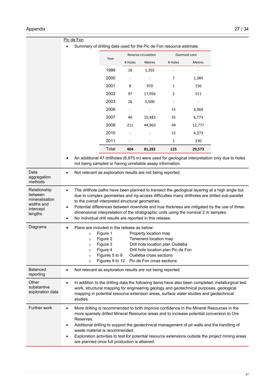 Appendix 27 / 34 27 Pic de Fon • Summary of drilling data used for the Pic de Fon resource estimate: Year Reverse circulation Diamond core # Holes Metres # Holes Metres 1999 16 1,355 - - 2000 - - 7 1,384 2001 8 970 1 156 2002 97 17,956 2 511 2003 26 5,500 - - 2006 - - 15 3,369 2007 46 10,482 35 6,773 2008 211 44,963 49 12,777 2010 - - 15 4,373 2011 - - 1 230 Total 404 81,282 125 29,573 • An additional 47 drillholes (6,975 m) were used for geological interpretation only due to holes not being sampled or having unreliable assay information. Data aggregation methods • Not relevant as exploration results are not being reported. Relationship between mineralisation widths and intercept lengths • The drillhole paths have been planned to transect the geological layering at a high angle but due to complex geometries and rig-access difficulties many drillholes are drilled sub-parallel to the overall interpreted structural geometries. • Potential differences between downhole and true thickness are mitigated by the use of three- dimensional interpretation of the stratigraphic units using the nominal 2 m samples. • No individual drill results are reported in this release. Diagrams • Plans are included in the release as below: o Figure 1 Property location map o Figure 2 Tenement location map o Figure 3 Drill hole location plan Ouéléba o Figure 4 Drill hole location plan Pic de Fon o Figures 5 to 8 Ouéléba cross sections o Figures 9 to 12 Pic de Fon cross sections Balanced reporting • Not relevant as exploration results are not being reported. Other substantive exploration data • In addition to the drilling data the following items have also been completed: metallurgical test work, structural mapping for engineering geology and geotechnical purposes, geological mapping in potential resource extension areas, surface water studies and geotechnical studies. Further work • More drilling is recommended to both improve confidence in the Mineral Resources in the more sparsely drilled Mineral Resource areas and to increase potential conversion to Ore Reserves. • Additional drilling to support the geotechnical management of pit walls and the handling of waste material is recommended. • Exploration activities to test for potential resource extensions outside the project mining areas are planned once full production is attained.