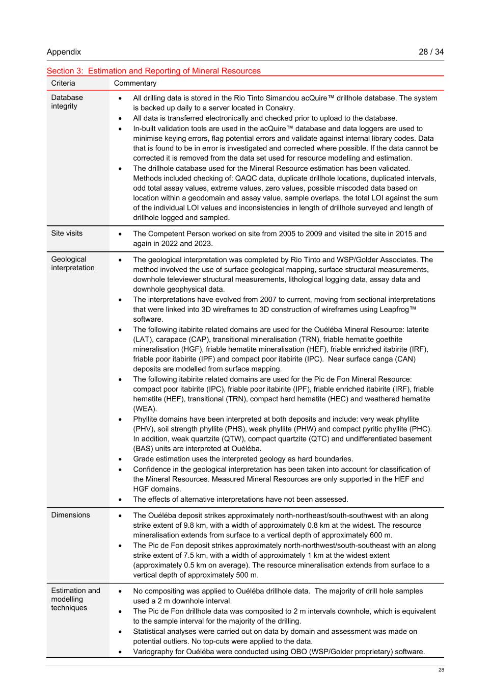 Appendix 28 / 34 28 Section 3: Estimation and Reporting of Mineral Resources Criteria Commentary Database integrity • All drilling data is stored in the Rio Tinto Simandou acQuire™ drillhole database. The system is backed up daily to a server located in Conakry. • All data is transferred electronically and checked prior to upload to the database. • In-built validation tools are used in the acQuire™ database and data loggers are used to minimise keying errors, flag potential errors and validate against internal library codes. Data that is found to be in error is investigated and corrected where possible. If the data cannot be corrected it is removed from the data set used for resource modelling and estimation. • The drillhole database used for the Mineral Resource estimation has been validated. Methods included checking of: QAQC data, duplicate drillhole locations, duplicated intervals, odd total assay values, extreme values, zero values, possible miscoded data based on location within a geodomain and assay value, sample overlaps, the total LOI against the sum of the individual LOI values and inconsistencies in length of drillhole surveyed and length of drillhole logged and sampled. Site visits • The Competent Person worked on site from 2005 to 2009 and visited the site in 2015 and again in 2022 and 2023. Geological interpretation • The geological interpretation was completed by Rio Tinto and WSP/Golder Associates. The method involved the use of surface geological mapping, surface structural measurements, downhole televiewer structural measurements, lithological logging data, assay data and downhole geophysical data. • The interpretations have evolved from 2007 to current, moving from sectional interpretations that were linked into 3D wireframes to 3D construction of wireframes using Leapfrog™ software. • The following itabirite related domains are used for the Ouéléba Mineral Resource: laterite (LAT), carapace (CAP), transitional mineralisation (TRN), friable hematite goethite mineralisation (HGF), friable hematite mineralisation (HEF), friable enriched itabirite (IRF), friable poor itabirite (IPF) and compact poor itabirite (IPC). Near surface canga (CAN) deposits are modelled from surface mapping. • The following itabirite related domains are used for the Pic de Fon Mineral Resource: compact poor itabirite (IPC), friable poor itabirite (IPF), friable enriched itabirite (IRF), friable hematite (HEF), transitional (TRN), compact hard hematite (HEC) and weathered hematite (WEA). • Phyllite domains have been interpreted at both deposits and include: very weak phyllite (PHV), soil strength phyllite (PHS), weak phyllite (PHW) and compact pyritic phyllite (PHC). In addition, weak quartzite (QTW), compact quartzite (QTC) and undifferentiated basement (BAS) units are interpreted at Ouéléba. • Grade estimation uses the interpreted geology as hard boundaries. • Confidence in the geological interpretation has been taken into account for classification of the Mineral Resources. Measured Mineral Resources are only supported in the HEF and HGF domains. • The effects of alternative interpretations have not been assessed. Dimensions • The Ouéléba deposit strikes approximately north-northeast/south-southwest with an along strike extent of 9.8 km, with a width of approximately 0.8 km at the widest. The resource mineralisation extends from surface to a vertical depth of approximately 600 m. • The Pic de Fon deposit strikes approximately north-northwest/south-southeast with an along strike extent of 7.5 km, with a width of approximately 1 km at the widest extent (approximately 0.5 km on average). The resource mineralisation extends from surface to a vertical depth of approximately 500 m. Estimation and modelling techniques • No compositing was applied to Ouéléba drillhole data. The majority of drill hole samples used a 2 m downhole interval. • The Pic de Fon drillhole data was composited to 2 m intervals downhole, which is equivalent to the sample interval for the majority of the drilling. • Statistical analyses were carried out on data by domain and assessment was made on potential outliers. No top-cuts were applied to the data. • Variography for Ouéléba were conducted using OBO (WSP/Golder proprietary) software.