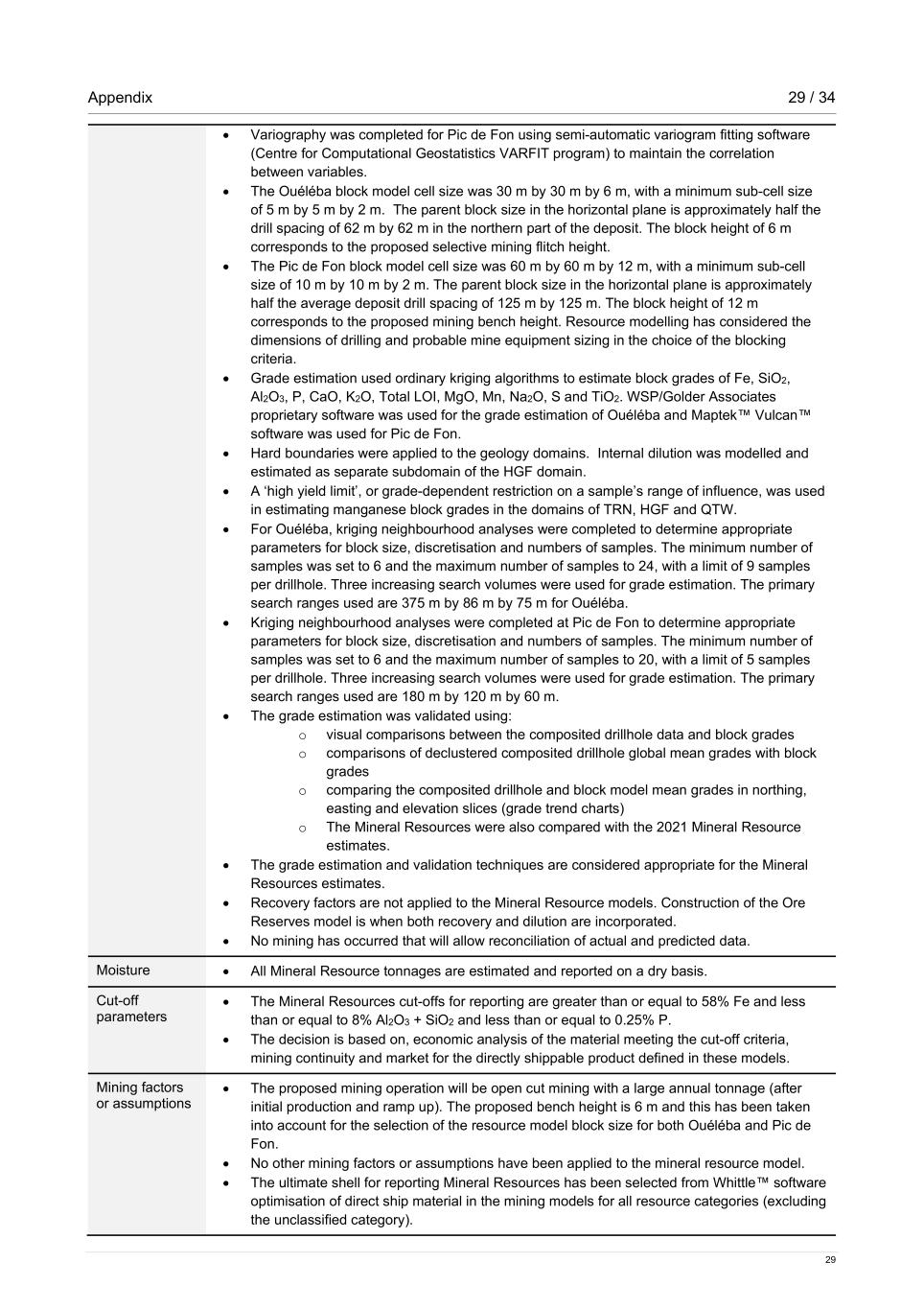 Appendix 29 / 34 29 • Variography was completed for Pic de Fon using semi-automatic variogram fitting software (Centre for Computational Geostatistics VARFIT program) to maintain the correlation between variables. • The Ouéléba block model cell size was 30 m by 30 m by 6 m, with a minimum sub-cell size of 5 m by 5 m by 2 m. The parent block size in the horizontal plane is approximately half the drill spacing of 62 m by 62 m in the northern part of the deposit. The block height of 6 m corresponds to the proposed selective mining flitch height. • The Pic de Fon block model cell size was 60 m by 60 m by 12 m, with a minimum sub-cell size of 10 m by 10 m by 2 m. The parent block size in the horizontal plane is approximately half the average deposit drill spacing of 125 m by 125 m. The block height of 12 m corresponds to the proposed mining bench height. Resource modelling has considered the dimensions of drilling and probable mine equipment sizing in the choice of the blocking criteria. • Grade estimation used ordinary kriging algorithms to estimate block grades of Fe, SiO2, Al2O3, P, CaO, K2O, Total LOI, MgO, Mn, Na2O, S and TiO2. WSP/Golder Associates proprietary software was used for the grade estimation of Ouéléba and Maptek™ Vulcan™ software was used for Pic de Fon. • Hard boundaries were applied to the geology domains. Internal dilution was modelled and estimated as separate subdomain of the HGF domain. • A ‘high yield limit’, or grade-dependent restriction on a sample’s range of influence, was used in estimating manganese block grades in the domains of TRN, HGF and QTW. • For Ouéléba, kriging neighbourhood analyses were completed to determine appropriate parameters for block size, discretisation and numbers of samples. The minimum number of samples was set to 6 and the maximum number of samples to 24, with a limit of 9 samples per drillhole. Three increasing search volumes were used for grade estimation. The primary search ranges used are 375 m by 86 m by 75 m for Ouéléba. • Kriging neighbourhood analyses were completed at Pic de Fon to determine appropriate parameters for block size, discretisation and numbers of samples. The minimum number of samples was set to 6 and the maximum number of samples to 20, with a limit of 5 samples per drillhole. Three increasing search volumes were used for grade estimation. The primary search ranges used are 180 m by 120 m by 60 m. • The grade estimation was validated using: o visual comparisons between the composited drillhole data and block grades o comparisons of declustered composited drillhole global mean grades with block grades o comparing the composited drillhole and block model mean grades in northing, easting and elevation slices (grade trend charts) o The Mineral Resources were also compared with the 2021 Mineral Resource estimates. • The grade estimation and validation techniques are considered appropriate for the Mineral Resources estimates. • Recovery factors are not applied to the Mineral Resource models. Construction of the Ore Reserves model is when both recovery and dilution are incorporated. • No mining has occurred that will allow reconciliation of actual and predicted data. Moisture • All Mineral Resource tonnages are estimated and reported on a dry basis. Cut-off parameters • The Mineral Resources cut-offs for reporting are greater than or equal to 58% Fe and less than or equal to 8% Al2O3 + SiO2 and less than or equal to 0.25% P. • The decision is based on, economic analysis of the material meeting the cut-off criteria, mining continuity and market for the directly shippable product defined in these models. Mining factors or assumptions • The proposed mining operation will be open cut mining with a large annual tonnage (after initial production and ramp up). The proposed bench height is 6 m and this has been taken into account for the selection of the resource model block size for both Ouéléba and Pic de Fon. • No other mining factors or assumptions have been applied to the mineral resource model. • The ultimate shell for reporting Mineral Resources has been selected from Whittle™ software optimisation of direct ship material in the mining models for all resource categories (excluding the unclassified category).