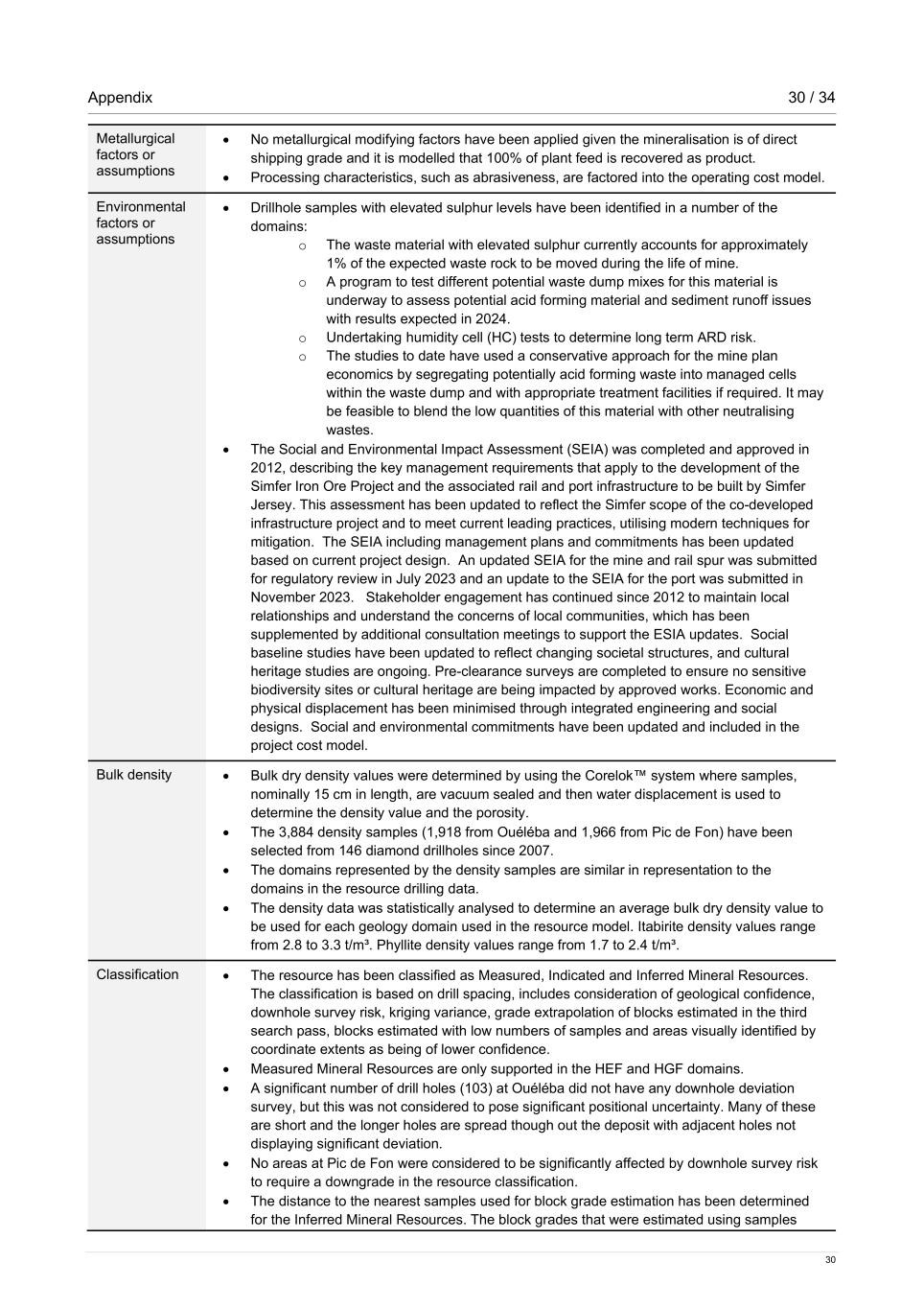 Appendix 30 / 34 30 Metallurgical factors or assumptions • No metallurgical modifying factors have been applied given the mineralisation is of direct shipping grade and it is modelled that 100% of plant feed is recovered as product. • Processing characteristics, such as abrasiveness, are factored into the operating cost model. Environmental factors or assumptions • Drillhole samples with elevated sulphur levels have been identified in a number of the domains: o The waste material with elevated sulphur currently accounts for approximately 1% of the expected waste rock to be moved during the life of mine. o A program to test different potential waste dump mixes for this material is underway to assess potential acid forming material and sediment runoff issues with results expected in 2024. o Undertaking humidity cell (HC) tests to determine long term ARD risk. o The studies to date have used a conservative approach for the mine plan economics by segregating potentially acid forming waste into managed cells within the waste dump and with appropriate treatment facilities if required. It may be feasible to blend the low quantities of this material with other neutralising wastes. • The Social and Environmental Impact Assessment (SEIA) was completed and approved in 2012, describing the key management requirements that apply to the development of the Simfer Iron Ore Project and the associated rail and port infrastructure to be built by Simfer Jersey. This assessment has been updated to reflect the Simfer scope of the co-developed infrastructure project and to meet current leading practices, utilising modern techniques for mitigation. The SEIA including management plans and commitments has been updated based on current project design. An updated SEIA for the mine and rail spur was submitted for regulatory review in July 2023 and an update to the SEIA for the port was submitted in November 2023. Stakeholder engagement has continued since 2012 to maintain local relationships and understand the concerns of local communities, which has been supplemented by additional consultation meetings to support the ESIA updates. Social baseline studies have been updated to reflect changing societal structures, and cultural heritage studies are ongoing. Pre-clearance surveys are completed to ensure no sensitive biodiversity sites or cultural heritage are being impacted by approved works. Economic and physical displacement has been minimised through integrated engineering and social designs. Social and environmental commitments have been updated and included in the project cost model. Bulk density • Bulk dry density values were determined by using the Corelok™ system where samples, nominally 15 cm in length, are vacuum sealed and then water displacement is used to determine the density value and the porosity. • The 3,884 density samples (1,918 from Ouéléba and 1,966 from Pic de Fon) have been selected from 146 diamond drillholes since 2007. • The domains represented by the density samples are similar in representation to the domains in the resource drilling data. • The density data was statistically analysed to determine an average bulk dry density value to be used for each geology domain used in the resource model. Itabirite density values range from 2.8 to 3.3 t/m³. Phyllite density values range from 1.7 to 2.4 t/m³. Classification • The resource has been classified as Measured, Indicated and Inferred Mineral Resources. The classification is based on drill spacing, includes consideration of geological confidence, downhole survey risk, kriging variance, grade extrapolation of blocks estimated in the third search pass, blocks estimated with low numbers of samples and areas visually identified by coordinate extents as being of lower confidence. • Measured Mineral Resources are only supported in the HEF and HGF domains. • A significant number of drill holes (103) at Ouéléba did not have any downhole deviation survey, but this was not considered to pose significant positional uncertainty. Many of these are short and the longer holes are spread though out the deposit with adjacent holes not displaying significant deviation. • No areas at Pic de Fon were considered to be significantly affected by downhole survey risk to require a downgrade in the resource classification. • The distance to the nearest samples used for block grade estimation has been determined for the Inferred Mineral Resources. The block grades that were estimated using samples