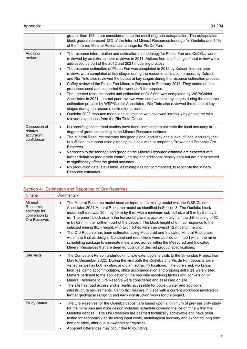Appendix 31 / 34 31 greater than 125 m are considered to be the result of grade extrapolation. The extrapolated block grades represent 12% of the Inferred Mineral Resources tonnage for Ouéléba and 14% of the Inferred Mineral Resources tonnage for Pic De Fon. Audits or reviews • The resource interpretation and estimation methodology for Pic de Fon and Ouéléba were reviewed by an external peer reviewer in 2011. Actions from the findings of that review were addressed as part of the 2012 and 2021 modelling process. • The resource estimation of Pic de Fon was completed in 2012 by Xstract. Internal peer reviews were completed at key stages during the resource estimation process by Xstract, and Rio Tinto also reviewed the output at key stages during the resource estimation process. • Coffey reviewed the Pic de Fon Minerals Resource in February 2015. They endorsed the processes used and supported the work as fit for purpose. • The updated resource model and estimation of Ouéléba was completed by WSP/Golder Associates in 2021. Internal peer reviews were completed at key stages during the resource estimation process by WSP/Golder Associates. Rio Tinto also reviewed the output at key stages during the resource estimation process. • Ouéléba 2022 resource model and estimation was reviewed internally by geologists with relevant experience from the Rio Tinto Group. Discussion of relative accuracy/ confidence • No specific geostatistical studies have been completed to estimate the local accuracy or degree of grade smoothing in the Mineral Resource estimate. • The Mineral Resource estimate has good global accuracy and a level of local accuracy that is sufficient to support mine planning studies aimed at preparing Proved and Probable Ore Reserves. • Variances to the tonnage and grade of the Mineral Resource estimate are expected with further definition (and grade control) drilling and additional density data but are not expected to significantly affect the global accuracy. • No production data is available, as mining has not commenced, to reconcile the Mineral Resource estimates. Section 4: Estimation and Reporting of Ore Reserves Criteria Commentary Mineral Resource estimate for conversion to Ore Reserves • The Mineral Resource model used as input to the mining model was the WSP/Golder Associates 2021 Mineral Resource model as identified in Section 3. The Ouéléba block model cell size was 30 m by 30 m by 6 m, with a minimum sub-cell size of 5 m by 5 m by 2 m. The parent block size in the horizontal plane is approximately half the drill spacing of 62 m by 62 m in the northern part of the deposit. The block height of 6 m corresponds to the selected mining flitch height, with two flitches within an overall 12 m bench height. • The Ore Reserve has been estimated using Measured and Indicated Mineral Resources within the final pit design. Contaminant restrictions were applied on import within the mine scheduling package to eliminate mineralised zones within the Measured and Indicated Mineral Resources that are deemed outside of desired product specifications. Site visits • The Competent Person undertook multiple extended site visits to the Simandou Project from May to December 2022. During the visit both the Ouéléba and Pic de Fon deposits were visited as well as both existing and planned facility locations. The core shed, workshop facilities, camp accommodation, office accommodation and ongoing drill sites were visited. Matters pertinent to the application of the requisite modifying factors and conversion of Mineral Resource to Ore Reserve were considered and assessed on site. • The site has road access and is readily accessible for power, water and additional infrastructure requirements. Camp facilities are in place with a current workforce involved in further geological sampling and early construction works for the project. Study Status • The Ore Reserves for the Ouéléba deposit are based upon a minimum of pre-feasibility study for the mine plan and mine design including schedule covering the life of mine within the Ouéléba deposit. The Ore Reserves are deemed technically achievable and have been tested for economic viability using input costs, metallurgical recovery and expected long term iron ore price, after due allowances for royalties. • Apparent differences may occur due to rounding.