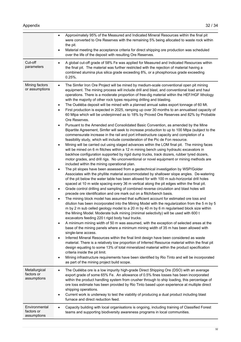 Appendix 32 / 34 32 • Approximately 95% of the Measured and Indicated Mineral Resources within the final pit were converted to Ore Reserves with the remaining 5% being allocated to waste rock within the pit. • Material meeting the acceptance criteria for direct shipping ore production was scheduled over the life of the deposit with resulting Ore Reserves. Cut-off parameters • A global cut-off grade of 58% Fe was applied for Measured and Indicated Resources within the final pit. The material was further restricted with the rejection of material having a combined alumina plus silica grade exceeding 8%, or a phosphorous grade exceeding 0.25%. Mining factors or assumptions • The Simfer Iron Ore Project will be mined by medium-scale conventional open pit mining equipment. The mining process will include drill and blast, and conventional load and haul operations. There is a moderate proportion of free-dig material within the HEF/HGF lithology with the majority of other rock types requiring drilling and blasting. • The Ouéléba deposit will be mined with a planned annual sales export tonnage of 60 Mt. • First production is expected in 2025, ramping up over 30 months to an annualised capacity of 60 Mtpa which will be underpinned as to 18% by Proved Ore Reserves and 82% by Probable Ore Reserves. • Pursuant to the Amended and Consolidated Basic Convention, as amended by the Mine Bipartite Agreement, Simfer will seek to increase production to up to 100 Mtpa (subject to the commensurate increase in the rail and port infrastructure capacity and completion of a feasibility study, which will include consideration of the Pic de Fon resource. • Mining will be carried out using staged advances within the LOM final pit. The mining faces will be mined on 6 m flitches within a 12 m mining bench using hydraulic excavators in backhoe configuration supported by rigid dump trucks, track dozers, rubber tyred dozers, motor grades, and drill rigs. No unconventional or novel equipment or mining methods are included within the mining operational plan. • The pit slopes have been assessed from a geotechnical investigation by WSP/Golder Associates with the phyllite material accommodated by shallower slope angles. De-watering of the pit below the water table has been allowed for with 100 m sub-horizontal drill holes spaced at 10 m wide spacing every 36 m vertical along the pit edges within the final pit. • Grade control drilling and sampling of combined reverse circulation and blast holes will precede ore identification and ore mark out on a flitch/bench basis. • The mining block model has assumed that sufficient account for estimated ore loss and dilution has been incorporated into the Mining Model with the regularization from the 5 m by 5 m by 2 m sub celled geology model to a 20 m by 40 m by 6 m regularised block size within the Mining Model. Moderate bulk mining (minimal selectivity) will be used with 600 t excavators feeding 220 t rigid body haul trucks. • A minimum mining width of 50 m was assumed, with the exception of selected areas at the base of the mining panels where a minimum mining width of 35 m has been allowed with single-lane access. • Inferred Mineral Resources within the final limit design have been considered as waste material. There is a relatively low proportion of Inferred Resource material within the final pit design equating to some 13% of total mineralized material within the product specification criteria inside the pit limit. • Mining infrastructure requirements have been identified by Rio Tinto and will be incorporated as part of the mining project build scope. Metallurgical factors or assumptions • The Ouéléba ore is a low impurity high-grade Direct Shipping Ore (DSO) with an average export grade of some 65% Fe. An allowance of 0.5% fines losses has been incorporated within the product handling system from crusher through to ship loading, this percentage of ore loss estimate has been provided by Rio Tinto based upon experience at multiple direct shipping operations. • Current work is underway to test the viability of producing a dual product including blast furnace and direct reduction feed. Environmental factors or assumptions • Capacity building with local organisations is ongoing, including training of Classified Forest teams and supporting biodiversity awareness programs in local communities.