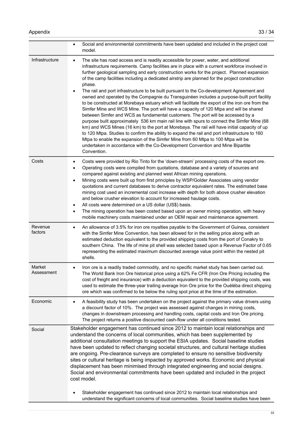 Appendix 33 / 34 33 • Social and environmental commitments have been updated and included in the project cost model. Infrastructure • The site has road access and is readily accessible for power, water, and additional infrastructure requirements. Camp facilities are in place with a current workforce involved in further geological sampling and early construction works for the project. Planned expansion of the camp facilities including a dedicated airstrip are planned for the project construction phase. • The rail and port infrastructure to be built pursuant to the Co-development Agreement and owned and operated by the Compagnie du Transguinéen includes a purpose-built port facility to be constructed at Morebaya estuary which will facilitate the export of the iron ore from the Simfer Mine and WCS Mine. The port will have a capacity of 120 Mtpa and will be shared between Simfer and WCS as fundamental customers. The port will be accessed by a purpose built approximately 536 km main rail line with spurs to connect the Simfer Mine (68 km) and WCS Mines (16 km) to the port at Morebaya. The rail will have initial capacity of up to 120 Mtpa. Studies to confirm the ability to expand the rail and port infrastructure to 160 Mtpa to enable the expansion of the Simfer Mine from 60 Mtpa to 100 Mtpa will be undertaken in accordance with the Co-Development Convention and Mine Bipartite Convention. Costs • Costs were provided by Rio Tinto for the ‘down-stream’ processing costs of the export ore. • Operating costs were compiled from quotations, database and a variety of sources and compared against existing and planned west African mining operations. • Mining costs were built up from first principles by WSP/Golder Associates using vendor quotations and current databases to derive contractor equivalent rates. The estimated base mining cost used an incremental cost increase with depth for both above crusher elevation and below crusher elevation to account for increased haulage costs. • All costs were determined on a US dollar (US$) basis. • The mining operation has been costed based upon an owner mining operation, with heavy mobile machinery costs maintained under an OEM repair and maintenance agreement. Revenue factors • An allowance of 3.5% for iron ore royalties payable to the Government of Guinea, consistent with the Simfer Mine Convention, has been allowed for in the selling price along with an estimated deduction equivalent to the provided shipping costs from the port of Conakry to southern China. The life of mine pit shell was selected based upon a Revenue Factor of 0.65 representing the estimated maximum discounted average value point within the nested pit shells. Market Assessment • Iron ore is a readily traded commodity, and no specific market study has been carried out. The World Bank Iron Ore historical price using a 62% Fe CFR (Iron Ore Pricing including the cost of freight and insurance) with a deduction equivalent to the provided shipping costs, was used to estimate the three-year trailing average Iron Ore price for the Ouéléba direct shipping ore which was confirmed to be below the ruling spot price at the time of the estimation. Economic • A feasibility study has been undertaken on the project against the primary value drivers using a discount factor of 10%. The project was assessed against changes in mining costs, changes in downstream processing and handling costs, capital costs and Iron Ore pricing. The project returns a positive discounted cash-flow under all conditions tested. Social Stakeholder engagement has continued since 2012 to maintain local relationships and understand the concerns of local communities, which has been supplemented by additional consultation meetings to support the ESIA updates. Social baseline studies have been updated to reflect changing societal structures, and cultural heritage studies are ongoing. Pre-clearance surveys are completed to ensure no sensitive biodiversity sites or cultural heritage is being impacted by approved works. Economic and physical displacement has been minimised through integrated engineering and social designs. Social and environmental commitments have been updated and included in the project cost model. • Stakeholder engagement has continued since 2012 to maintain local relationships and understand the significant concerns of local communities. Social baseline studies have been