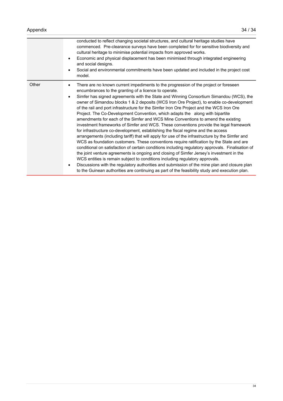 Appendix 34 / 34 34 conducted to reflect changing societal structures, and cultural heritage studies have commenced. Pre-clearance surveys have been completed for for sensitive biodiversity and cultural heritage to minimise potential impacts from approved works. • Economic and physical displacement has been minimised through integrated engineering and social designs. • Social and environmental commitments have been updated and included in the project cost model. Other • There are no known current impediments to the progression of the project or foreseen encumbrances to the granting of a licence to operate. • Simfer has signed agreements with the State and Winning Consortium Simandou (WCS), the owner of Simandou blocks 1 & 2 deposits (WCS Iron Ore Project), to enable co-development of the rail and port infrastructure for the Simfer Iron Ore Project and the WCS Iron Ore Project. The Co-Development Convention, which adapts the along with bipartite amendments for each of the Simfer and WCS Mine Conventions to amend the existing investment frameworks of Simfer and WCS. These conventions provide the legal framework for infrastructure co-development, establishing the fiscal regime and the access arrangements (including tariff) that will apply for use of the infrastructure by the Simfer and WCS as foundation customers. These conventions require ratification by the State and are conditional on satisfaction of certain conditions including regulatory approvals. Finalisation of the joint venture agreements is ongoing and closing of Simfer Jersey’s investment in the WCS entities is remain subject to conditions including regulatory approvals. • Discussions with the regulatory authorities and submission of the mine plan and closure plan to the Guinean authorities are continuing as part of the feasibility study and execution plan.