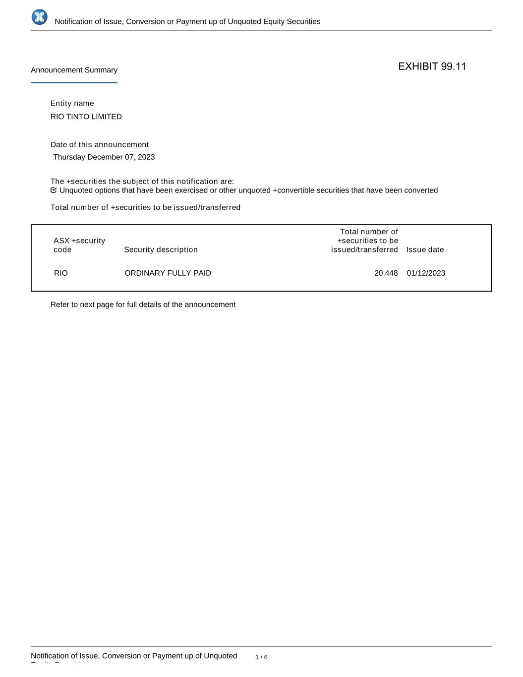 Notification of Issue, Conversion or Payment up of Unquoted Equity Securities Notification of Issue, Conversion or Payment up of Unquoted Equity Securities 1 / 6 Announcement Summary Entity name RIO TINTO LIMITED Date of this announcement Thursday December 07, 2023 The +securities the subject of this notification are: Total number of +securities to be issued/transferred ASX +security code Security description Total number of +securities to be issued/transferred Issue date RIO ORDINARY FULLY PAID 20,448 01/12/2023 Refer to next page for full details of the announcement Unquoted options that have been exercised or other unquoted +convertible securities that have been converted EXHIBIT 99.11