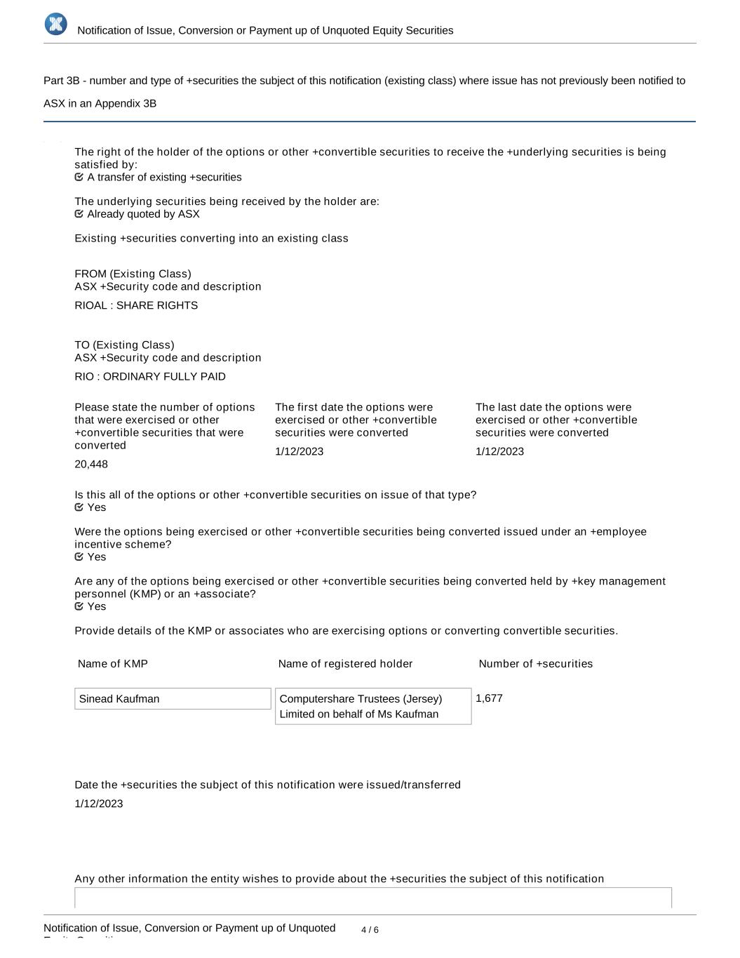 Notification of Issue, Conversion or Payment up of Unquoted Equity Securities Notification of Issue, Conversion or Payment up of Unquoted Equity Securities 4 / 6 Part 3B - number and type of +securities the subject of this notification (existing class) where issue has not previously been notified to ASX in an Appendix 3B The right of the holder of the options or other +convertible securities to receive the +underlying securities is being satisfied by: The underlying securities being received by the holder are: Existing +securities converting into an existing class FROM (Existing Class) ASX +Security code and description RIOAL : SHARE RIGHTS TO (Existing Class) ASX +Security code and description RIO : ORDINARY FULLY PAID Please state the number of options that were exercised or other +convertible securities that were converted 20,448 The first date the options were exercised or other +convertible securities were converted 1/12/2023 The last date the options were exercised or other +convertible securities were converted 1/12/2023 Is this all of the options or other +convertible securities on issue of that type? Were the options being exercised or other +convertible securities being converted issued under an +employee incentive scheme? Are any of the options being exercised or other +convertible securities being converted held by +key management personnel (KMP) or an +associate? Provide details of the KMP or associates who are exercising options or converting convertible securities. Name of KMP Name of registered holder Number of +securities Sinead Kaufman Computershare Trustees (Jersey) Limited on behalf of Ms Kaufman 1,677 Date the +securities the subject of this notification were issued/transferred 1/12/2023 Any other information the entity wishes to provide about the +securities the subject of this notification Yes Yes Yes Already quoted by ASX A transfer of existing +securities