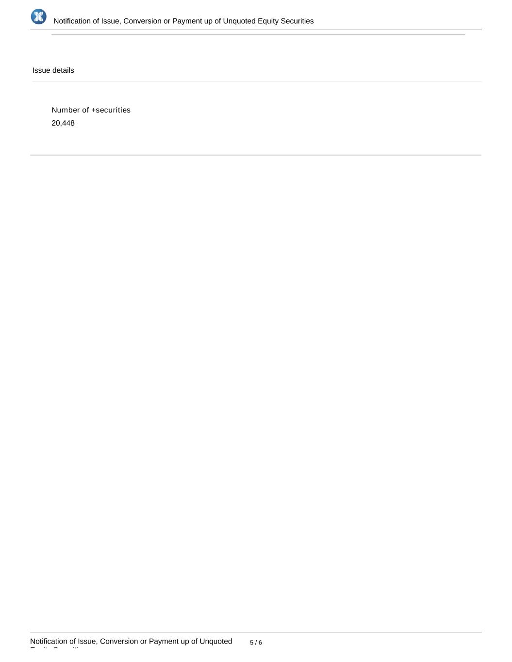 Notification of Issue, Conversion or Payment up of Unquoted Equity Securities Notification of Issue, Conversion or Payment up of Unquoted Equity Securities 5 / 6 Issue details Number of +securities 20,448