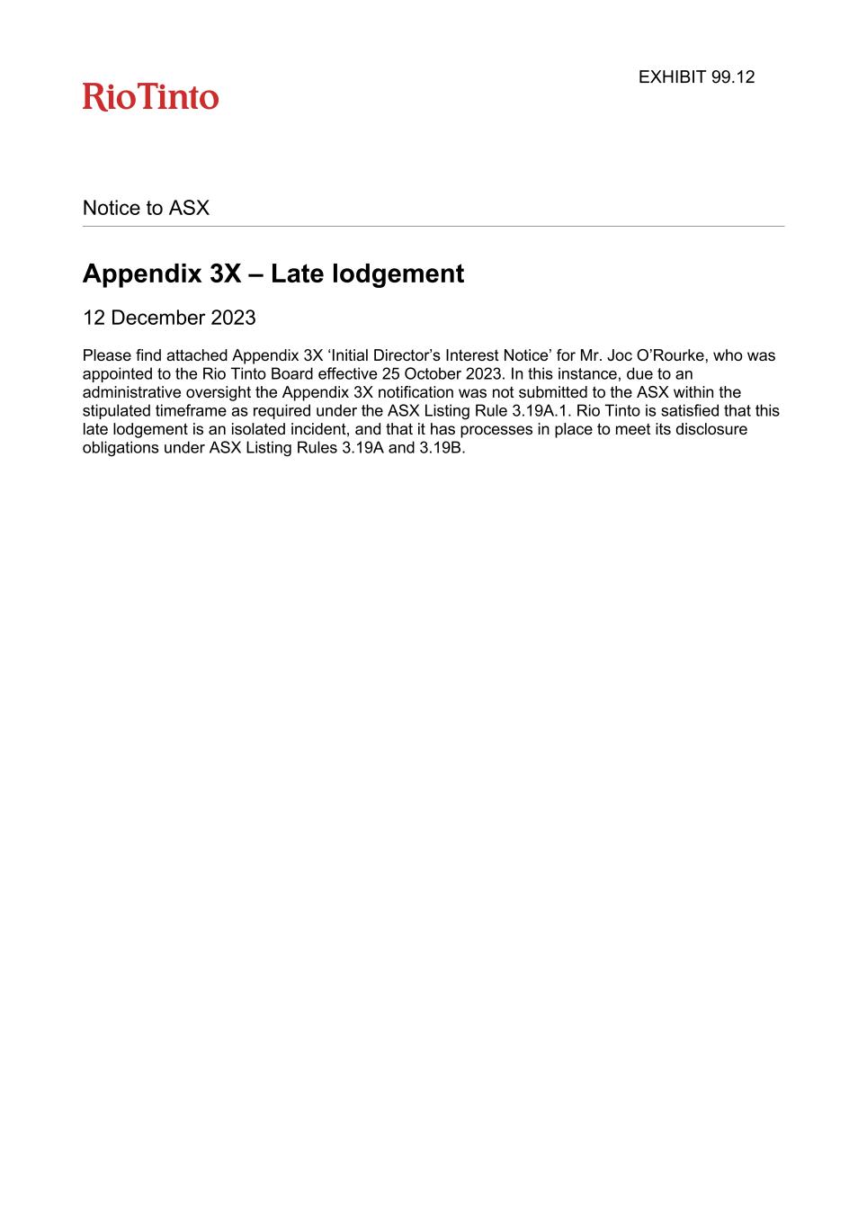 Notice to ASX Appendix 3X – Late lodgement 12 December 2023 Please find attached Appendix 3X ‘Initial Director’s Interest Notice’ for Mr. Joc O’Rourke, who was appointed to the Rio Tinto Board effective 25 October 2023. In this instance, due to an administrative oversight the Appendix 3X notification was not submitted to the ASX within the stipulated timeframe as required under the ASX Listing Rule 3.19A.1. Rio Tinto is satisfied that this late lodgement is an isolated incident, and that it has processes in place to meet its disclosure obligations under ASX Listing Rules 3.19A and 3.19B. EXHIBIT 99.12