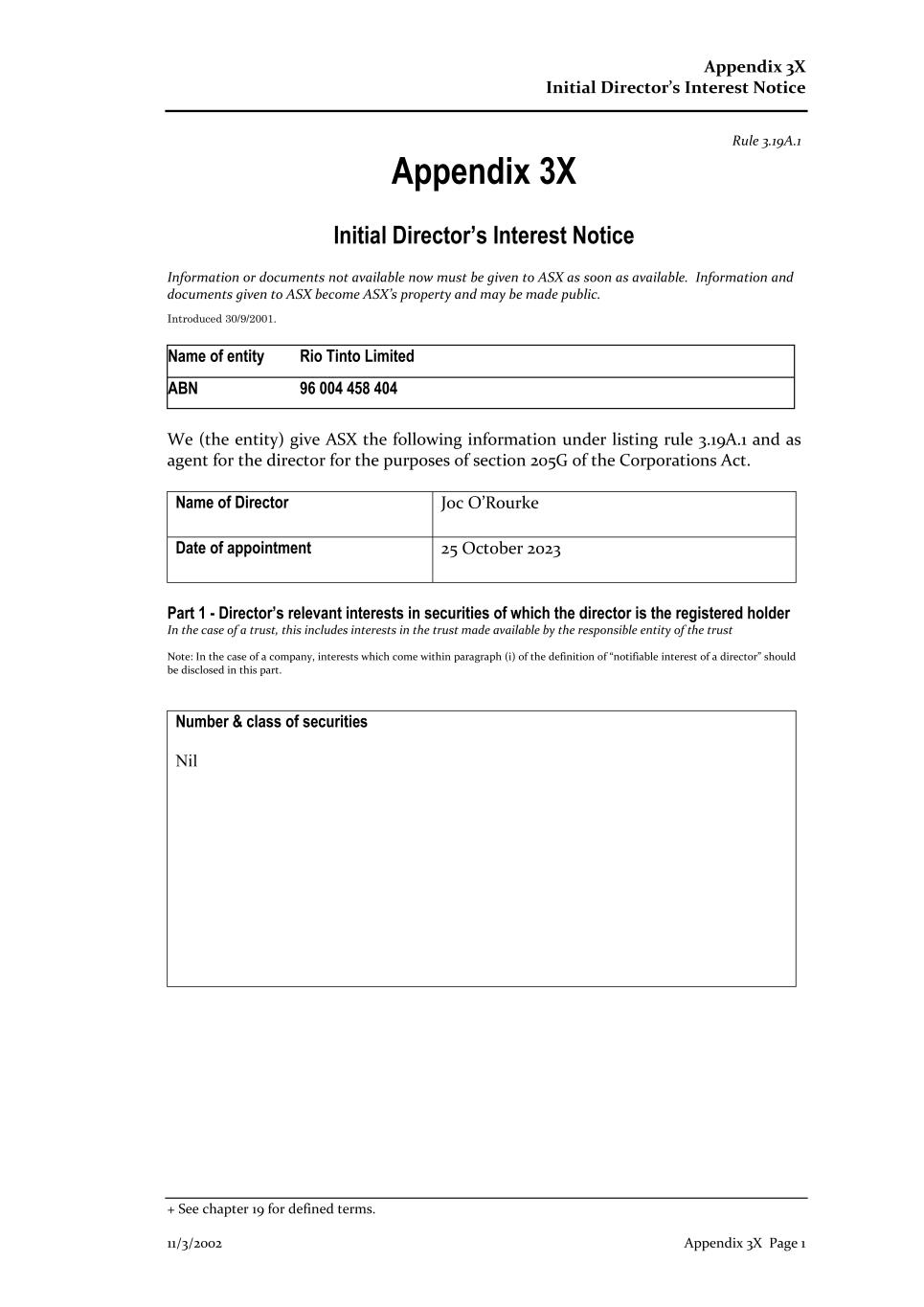 Appendix 3X Initial Director’s Interest Notice + See chapter 19 for defined terms. 11/3/2002 Appendix 3X Page 1 Rule 3.19A.1 Appendix 3X Initial Director’s Interest Notice Information or documents not available now must be given to ASX as soon as available. Information and documents given to ASX become ASX’s property and may be made public. Introduced 30/9/2001. Name of entity Rio Tinto Limited ABN 96 004 458 404 We (the entity) give ASX the following information under listing rule 3.19A.1 and as agent for the director for the purposes of section 205G of the Corporations Act. Name of Director Joc O’Rourke Date of appointment 25 October 2023 Part 1 - Director’s relevant interests in securities of which the director is the registered holder In the case of a trust, this includes interests in the trust made available by the responsible entity of the trust Note: In the case of a company, interests which come within paragraph (i) of the definition of “notifiable interest of a director” should be disclosed in this part. Number & class of securities Nil