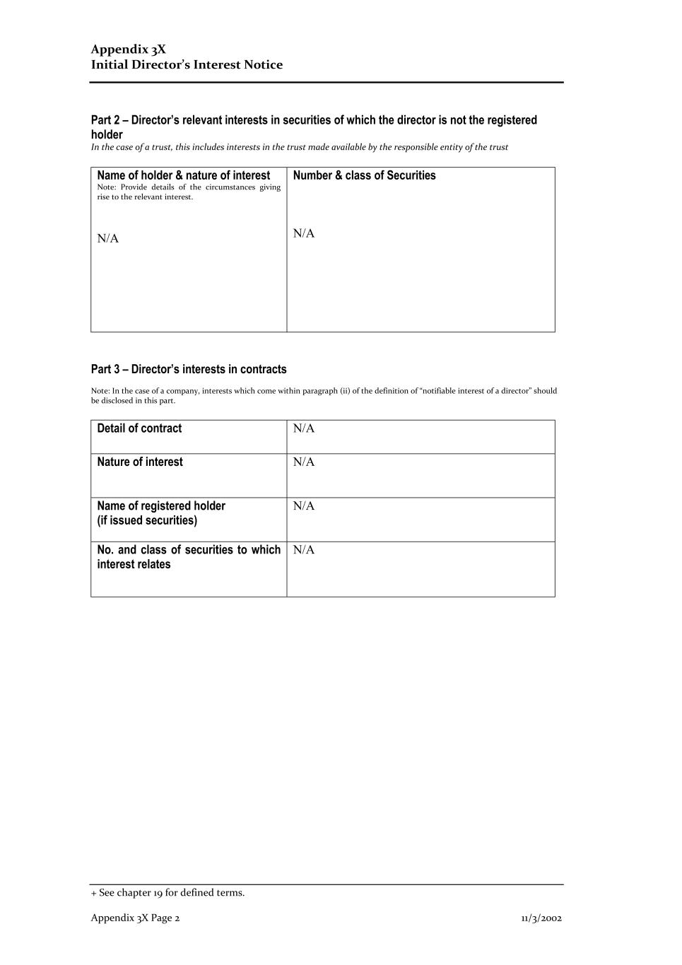 Appendix 3X Initial Director’s Interest Notice + See chapter 19 for defined terms. Appendix 3X Page 2 11/3/2002 Part 2 – Director’s relevant interests in securities of which the director is not the registered holder In the case of a trust, this includes interests in the trust made available by the responsible entity of the trust Name of holder & nature of interest Note: Provide details of the circumstances giving rise to the relevant interest. N/A Number & class of Securities N/A Part 3 – Director’s interests in contracts Note: In the case of a company, interests which come within paragraph (ii) of the definition of “notifiable interest of a director” should be disclosed in this part. Detail of contract N/A Nature of interest N/A Name of registered holder (if issued securities) N/A No. and class of securities to which interest relates N/A