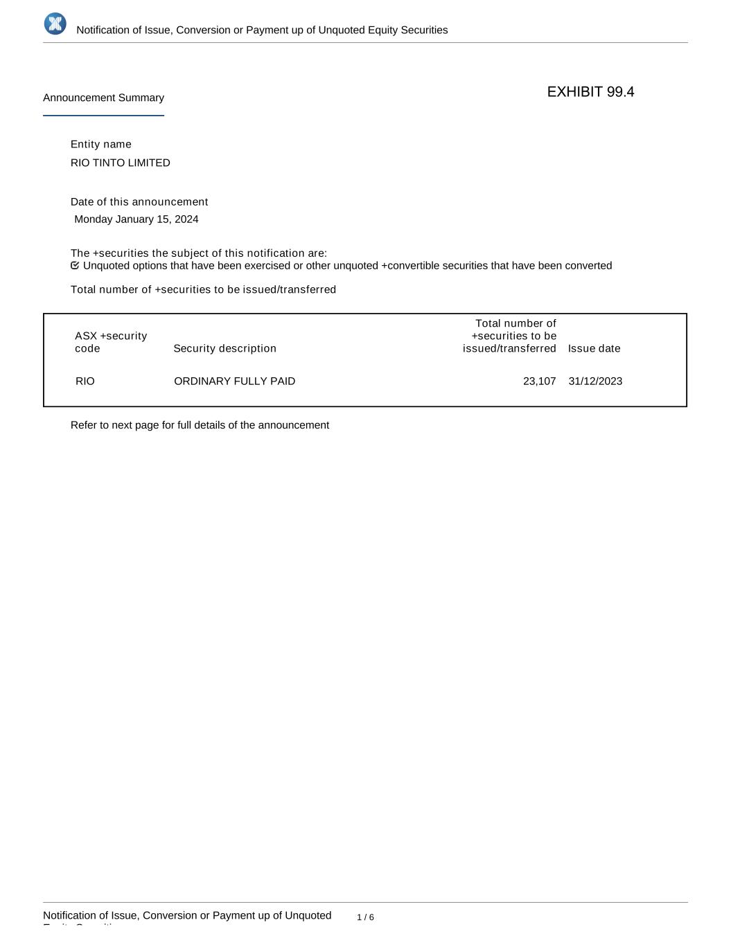 Notification of Issue, Conversion or Payment up of Unquoted Equity Securities Notification of Issue, Conversion or Payment up of Unquoted Equity Securities 1 / 6 Announcement Summary Entity name RIO TINTO LIMITED Date of this announcement Monday January 15, 2024 The +securities the subject of this notification are: Total number of +securities to be issued/transferred ASX +security code Security description Total number of +securities to be issued/transferred Issue date RIO ORDINARY FULLY PAID 23,107 31/12/2023 Refer to next page for full details of the announcement Unquoted options that have been exercised or other unquoted +convertible securities that have been converted EXHIBIT 99.4