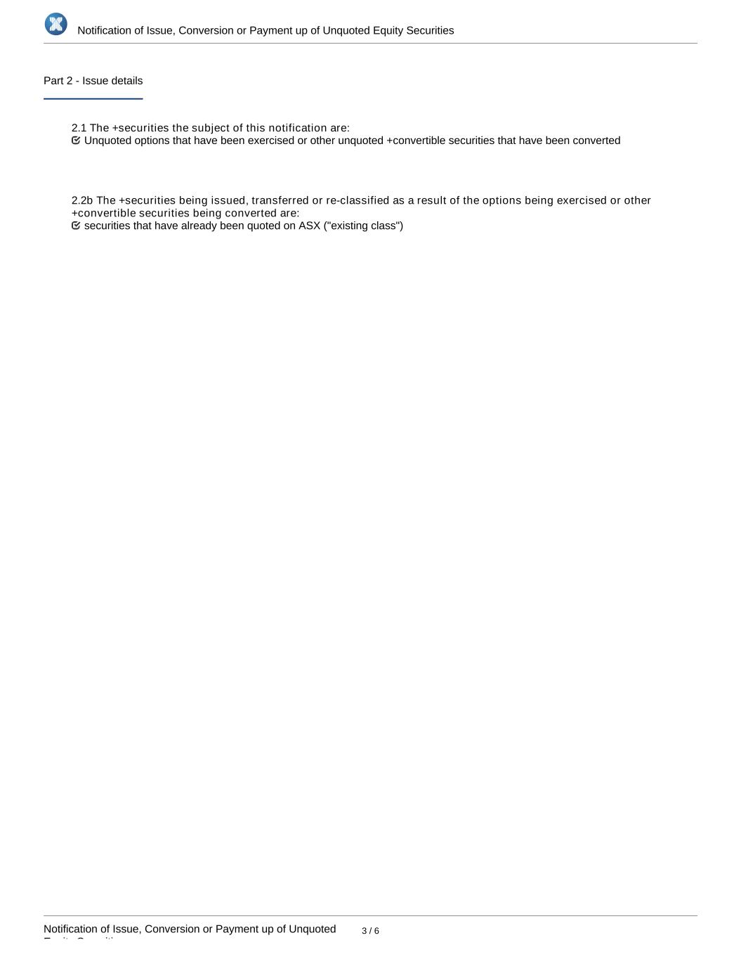 Notification of Issue, Conversion or Payment up of Unquoted Equity Securities Notification of Issue, Conversion or Payment up of Unquoted Equity Securities 3 / 6 Part 2 - Issue details 2.1 The +securities the subject of this notification are: 2.2b The +securities being issued, transferred or re-classified as a result of the options being exercised or other +convertible securities being converted are: securities that have already been quoted on ASX ("existing class") Unquoted options that have been exercised or other unquoted +convertible securities that have been converted