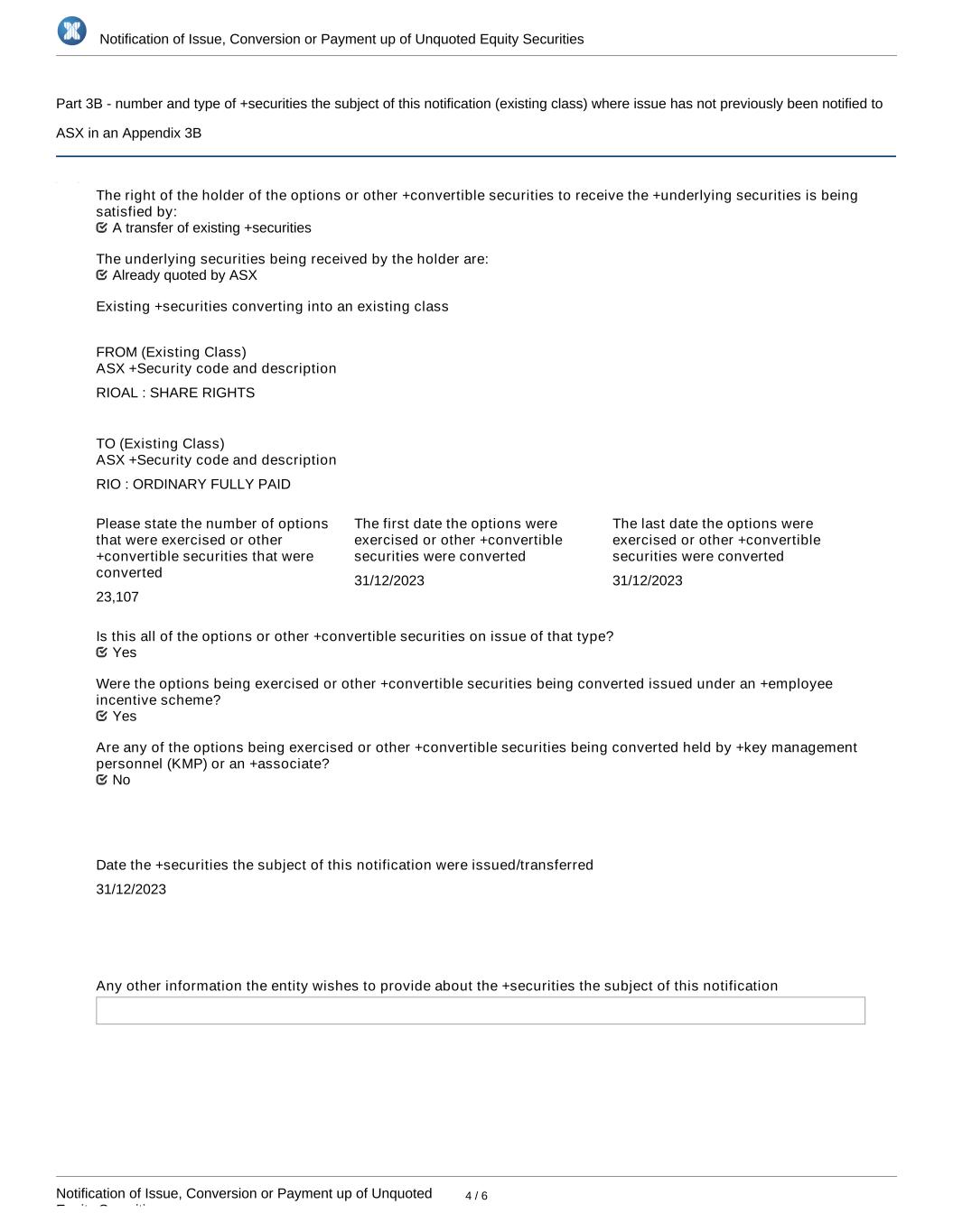 Notification of Issue, Conversion or Payment up of Unquoted Equity Securities Notification of Issue, Conversion or Payment up of Unquoted Equity Securities 4 / 6 Part 3B - number and type of +securities the subject of this notification (existing class) where issue has not previously been notified to ASX in an Appendix 3B The right of the holder of the options or other +convertible securities to receive the +underlying securities is being satisfied by: The underlying securities being received by the holder are: Existing +securities converting into an existing class FROM (Existing Class) ASX +Security code and description RIOAL : SHARE RIGHTS TO (Existing Class) ASX +Security code and description RIO : ORDINARY FULLY PAID Please state the number of options that were exercised or other +convertible securities that were converted 23,107 The first date the options were exercised or other +convertible securities were converted 31/12/2023 The last date the options were exercised or other +convertible securities were converted 31/12/2023 Is this all of the options or other +convertible securities on issue of that type? Were the options being exercised or other +convertible securities being converted issued under an +employee incentive scheme? Are any of the options being exercised or other +convertible securities being converted held by +key management personnel (KMP) or an +associate? Date the +securities the subject of this notification were issued/transferred 31/12/2023 Any other information the entity wishes to provide about the +securities the subject of this notification No Yes Yes Already quoted by ASX A transfer of existing +securities