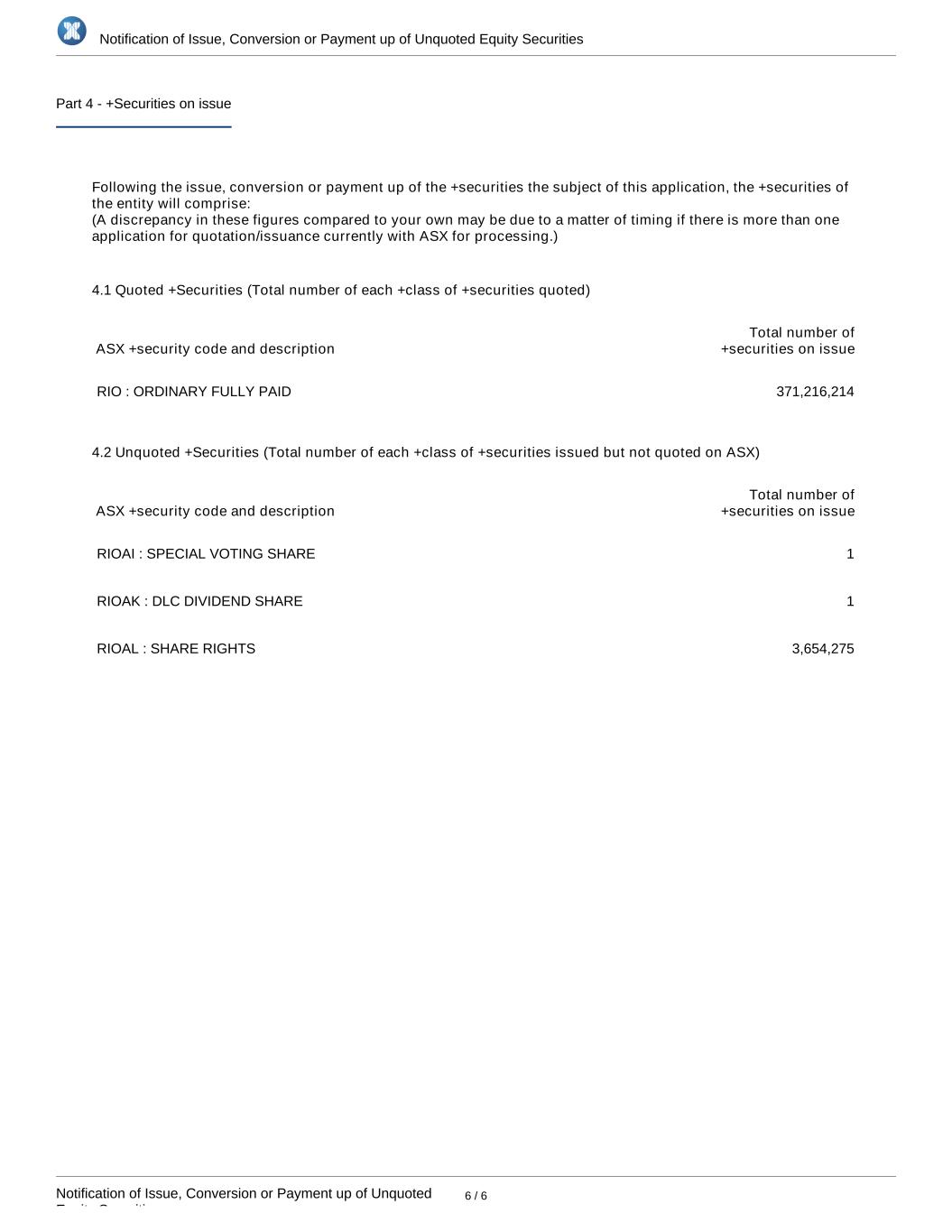 Notification of Issue, Conversion or Payment up of Unquoted Equity Securities Notification of Issue, Conversion or Payment up of Unquoted Equity Securities 6 / 6 Part 4 - +Securities on issue Following the issue, conversion or payment up of the +securities the subject of this application, the +securities of the entity will comprise: (A discrepancy in these figures compared to your own may be due to a matter of timing if there is more than one application for quotation/issuance currently with ASX for processing.) 4.1 Quoted +Securities (Total number of each +class of +securities quoted) ASX +security code and description Total number of +securities on issue RIO : ORDINARY FULLY PAID 371,216,214 4.2 Unquoted +Securities (Total number of each +class of +securities issued but not quoted on ASX) ASX +security code and description Total number of +securities on issue RIOAI : SPECIAL VOTING SHARE 1 RIOAK : DLC DIVIDEND SHARE 1 RIOAL : SHARE RIGHTS 3,654,275