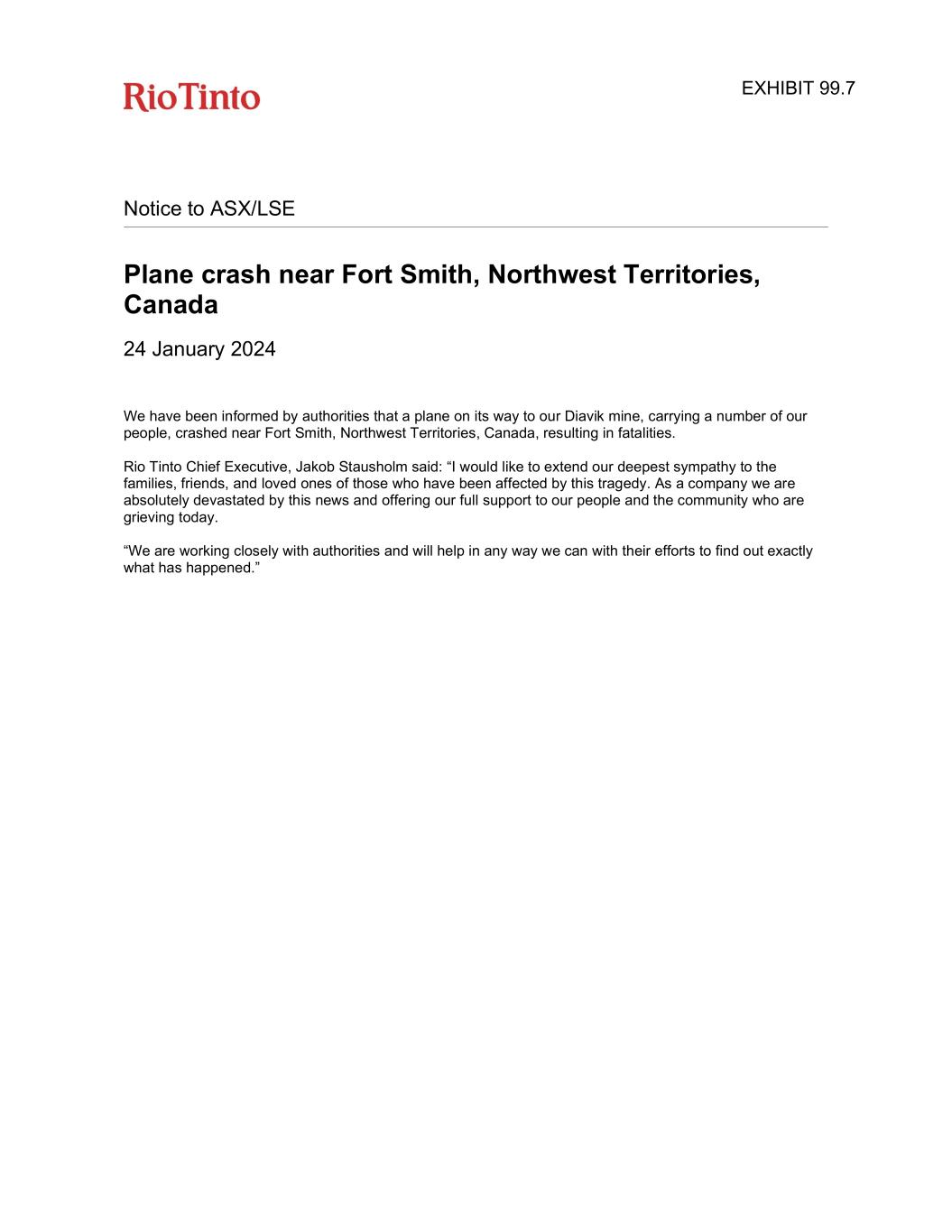 Notice to ASX/LSE Plane crash near Fort Smith, Northwest Territories, Canada 24 January 2024 We have been informed by authorities that a plane on its way to our Diavik mine, carrying a number of our people, crashed near Fort Smith, Northwest Territories, Canada, resulting in fatalities. Rio Tinto Chief Executive, Jakob Stausholm said: “I would like to extend our deepest sympathy to the families, friends, and loved ones of those who have been affected by this tragedy. As a company we are absolutely devastated by this news and offering our full support to our people and the community who are grieving today. “We are working closely with authorities and will help in any way we can with their efforts to find out exactly what has happened.” EXHIBIT 99.7