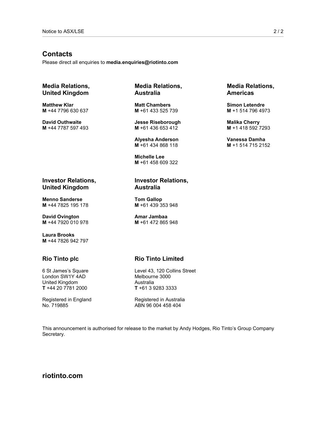 Notice to ASX/LSE 2 / 2 Contacts Please direct all enquiries to media.enquiries@riotinto.com Media Relations, United Kingdom Matthew Klar M +44 7796 630 637 David Outhwaite M +44 7787 597 493 Media Relations, Australia Matt Chambers M +61 433 525 739 Jesse Riseborough M +61 436 653 412 Alyesha Anderson M +61 434 868 118 Michelle Lee M +61 458 609 322 Media Relations, Americas Simon Letendre M +1 514 796 4973 Malika Cherry M +1 418 592 7293 Vanessa Damha M +1 514 715 2152 Investor Relations, United Kingdom Menno Sanderse M +44 7825 195 178 David Ovington M +44 7920 010 978 Laura Brooks M +44 7826 942 797 Investor Relations, Australia Tom Gallop M +61 439 353 948 Amar Jambaa M +61 472 865 948 Rio Tinto plc 6 St James’s Square London SW1Y 4AD United Kingdom T +44 20 7781 2000 Registered in England No. 719885 Rio Tinto Limited Level 43, 120 Collins Street Melbourne 3000 Australia T +61 3 9283 3333 Registered in Australia ABN 96 004 458 404 This announcement is authorised for release to the market by Andy Hodges, Rio Tinto’s Group Company Secretary. riotinto.com