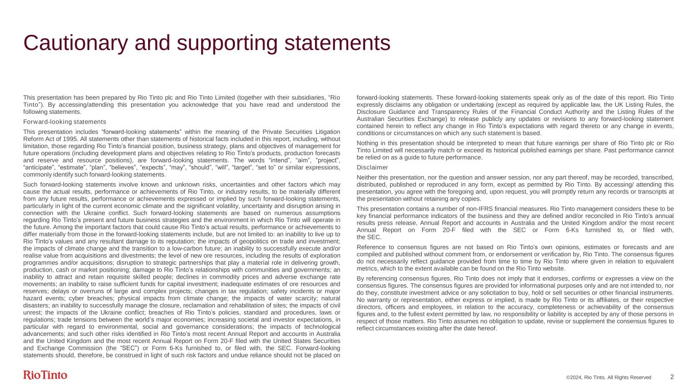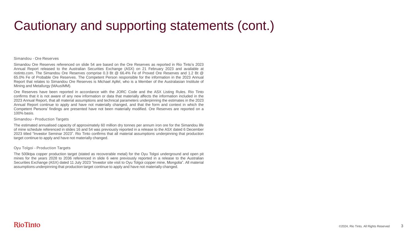 ©2024, Rio Tinto, All Rights Reserved 2 Cautionary and supporting statements This presentation has been prepared by Rio Tinto plc and Rio Tinto Limited (together with their subsidiaries, “Rio Tinto”). By accessing/attending this presentation you acknowledge that you have read and understood the following statements. Forward-looking statements This presentation includes “forward-looking statements” within the meaning of the Private Securities Litigation Reform Act of 1995. All statements other than statements of historical facts included in this report, including, without limitation, those regarding Rio Tinto’s financial position, business strategy, plans and objectives of management for future operations (including development plans and objectives relating to Rio Tinto’s products, production forecasts and reserve and resource positions), are forward-looking statements. The words “intend”, “aim”, “project”, “anticipate”, “estimate”, “plan”, “believes”, “expects”, “may”, “should”, “will”, “target”, “set to” or similar expressions, commonly identify such forward-looking statements. Such forward-looking statements involve known and unknown risks, uncertainties and other factors which may cause the actual results, performance or achievements of Rio Tinto, or industry results, to be materially different from any future results, performance or achievements expressed or implied by such forward-looking statements, particularly in light of the current economic climate and the significant volatility, uncertainty and disruption arising in connection with the Ukraine conflict. Such forward-looking statements are based on numerous assumptions regarding Rio Tinto’s present and future business strategies and the environment in which Rio Tinto will operate in the future. Among the important factors that could cause Rio Tinto’s actual results, performance or achievements to differ materially from those in the forward-looking statements include, but are not limited to: an inability to live up to Rio Tinto’s values and any resultant damage to its reputation; the impacts of geopolitics on trade and investment; the impacts of climate change and the transition to a low-carbon future; an inability to successfully execute and/or realise value from acquisitions and divestments; the level of new ore resources, including the results of exploration programmes and/or acquisitions; disruption to strategic partnerships that play a material role in delivering growth, production, cash or market positioning; damage to Rio Tinto’s relationships with communities and governments; an inability to attract and retain requisite skilled people; declines in commodity prices and adverse exchange rate movements; an inability to raise sufficient funds for capital investment; inadequate estimates of ore resources and reserves; delays or overruns of large and complex projects; changes in tax regulation; safety incidents or major hazard events; cyber breaches; physical impacts from climate change; the impacts of water scarcity; natural disasters; an inability to successfully manage the closure, reclamation and rehabilitation of sites; the impacts of civil unrest; the impacts of the Ukraine conflict; breaches of Rio Tinto’s policies, standard and procedures, laws or regulations; trade tensions between the world’s major economies; increasing societal and investor expectations, in particular with regard to environmental, social and governance considerations; the impacts of technological advancements; and such other risks identified in Rio Tinto’s most recent Annual Report and accounts in Australia and the United Kingdom and the most recent Annual Report on Form 20-F filed with the United States Securities and Exchange Commission (the “SEC”) or Form 6-Ks furnished to, or filed with, the SEC. Forward-looking statements should, therefore, be construed in light of such risk factors and undue reliance should not be placed on forward-looking statements. These forward-looking statements speak only as of the date of this report. Rio Tinto expressly disclaims any obligation or undertaking (except as required by applicable law, the UK Listing Rules, the Disclosure Guidance and Transparency Rules of the Financial Conduct Authority and the Listing Rules of the Australian Securities Exchange) to release publicly any updates or revisions to any forward-looking statement contained herein to reflect any change in Rio Tinto’s expectations with regard thereto or any change in events, conditions or circumstances on which any such statement is based. Nothing in this presentation should be interpreted to mean that future earnings per share of Rio Tinto plc or Rio Tinto Limited will necessarily match or exceed its historical published earnings per share. Past performance cannot be relied on as a guide to future performance. Disclaimer Neither this presentation, nor the question and answer session, nor any part thereof, may be recorded, transcribed, distributed, published or reproduced in any form, except as permitted by Rio Tinto. By accessing/ attending this presentation, you agree with the foregoing and, upon request, you will promptly return any records or transcripts at the presentation without retaining any copies. This presentation contains a number of non-IFRS financial measures. Rio Tinto management considers these to be key financial performance indicators of the business and they are defined and/or reconciled in Rio Tinto’s annual results press release, Annual Report and accounts in Australia and the United Kingdom and/or the most recent Annual Report on Form 20-F filed with the SEC or Form 6-Ks furnished to, or filed with, the SEC. Reference to consensus figures are not based on Rio Tinto’s own opinions, estimates or forecasts and are compiled and published without comment from, or endorsement or verification by, Rio Tinto. The consensus figures do not necessaril