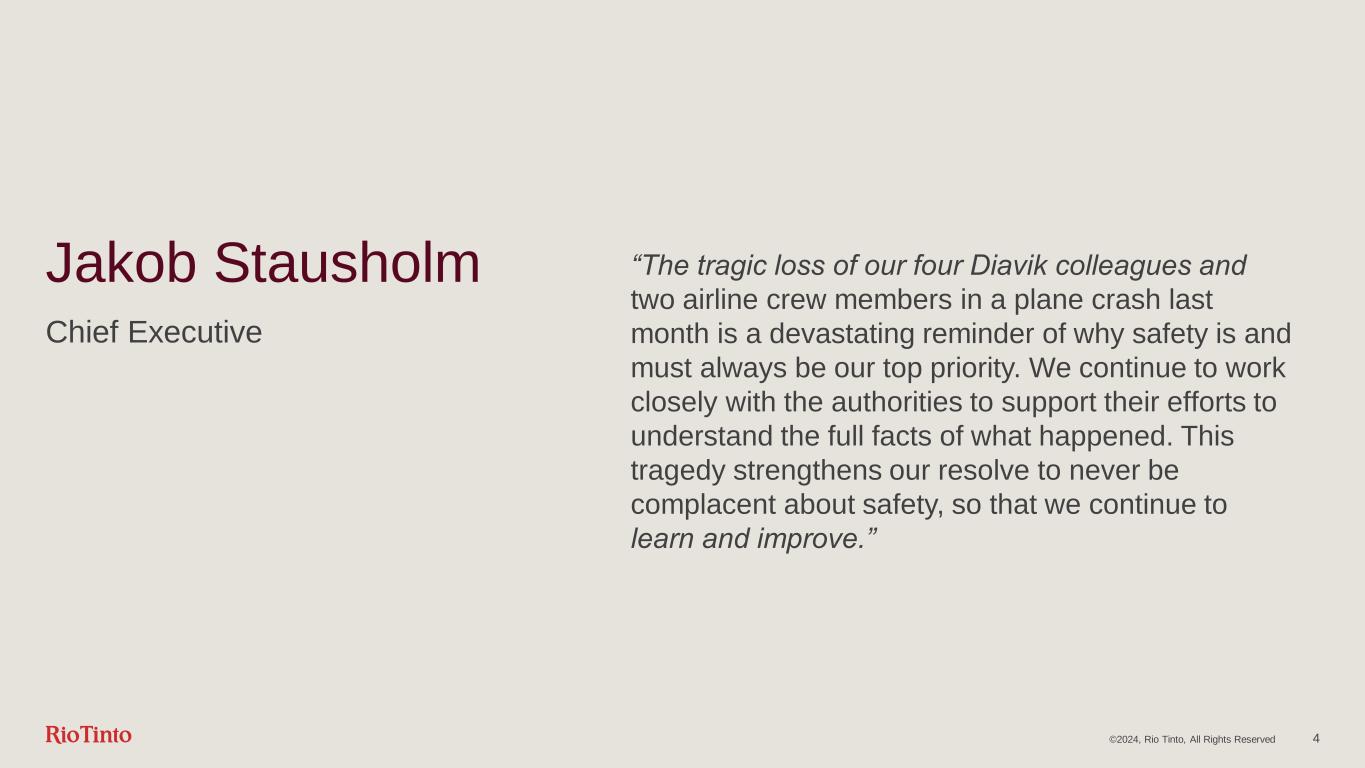 ©2024, Rio Tinto, All Rights Reserved 3 Cautionary and supporting statements (cont.) Simandou - Ore Reserves Simandou Ore Reserves referenced on slide 54 are based on the Ore Reserves as reported in Rio Tinto’s 2023 Annual Report released to the Australian Securities Exchange (ASX) on 21 February 2023 and available at riotinto.com. The Simandou Ore Reserves comprise 0.3 Bt @ 66.4% Fe of Proved Ore Reserves and 1.2 Bt @ 65.0% Fe of Probable Ore Reserves. The Competent Person responsible for the information in the 2023 Annual Report that relates to Simandou Ore Reserves is Michael Apfel, who is a Member of the Australasian Institute of Mining and Metallurgy (MAusIMM). Ore Reserves have been reported in accordance with the JORC Code and the ASX Listing Rules. Rio Tinto confirms that it is not aware of any new information or data that materially affects the information included in the 2023 Annual Report, that all material assumptions and technical parameters underpinning the estimates in the 2023 Annual Report continue to apply and have not materially changed, and that the form and context in which the Competent Persons’ findings are presented have not been materially modified. Ore Reserves are reported on a 100% basis. Simandou - Production Targets The estimated annualised capacity of approximately 60 million dry tonnes per annum iron ore for the Simandou life of mine schedule referenced in slides 16 and 54 was previously reported in a release to the ASX dated 6 December 2023 titled “Investor Seminar 2023”. Rio Tinto confirms that all material assumptions underpinning that production target continue to apply and have not materially changed. Oyu Tolgoi - Production Targets The 500ktpa copper production target (stated as recoverable metal) for the Oyu Tolgoi underground and open pit mines for the years 2028 to 2036 referenced in slide 6 were previously reported in a release to the Australian Securities Exchange (ASX) dated 11 July 2023 “Investor site visit to Oyu Tolgoi copper mine, Mongolia”. All material assumptions underpinning that production target continue to apply and have not materially changed.