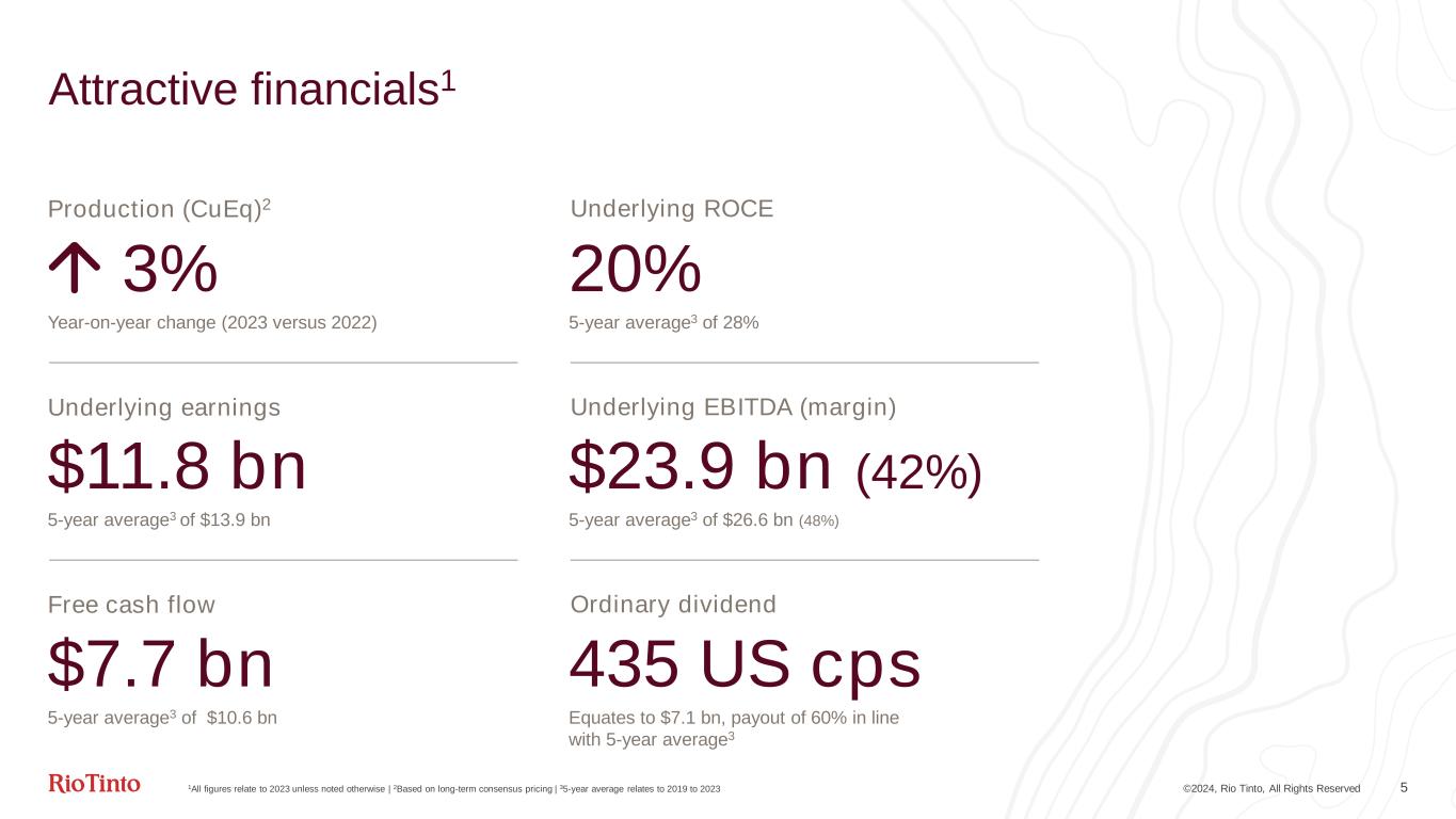 Jakob Stausholm Chief Executive ©2024, Rio Tinto, All Rights Reserved 4 “The tragic loss of our four Diavik colleagues and two airline crew members in a plane crash last month is a devastating reminder of why safety is and must always be our top priority. We continue to work closely with the authorities to support their efforts to understand the full facts of what happened. This tragedy strengthens our resolve to never be complacent about safety, so that we continue to learn and improve.”