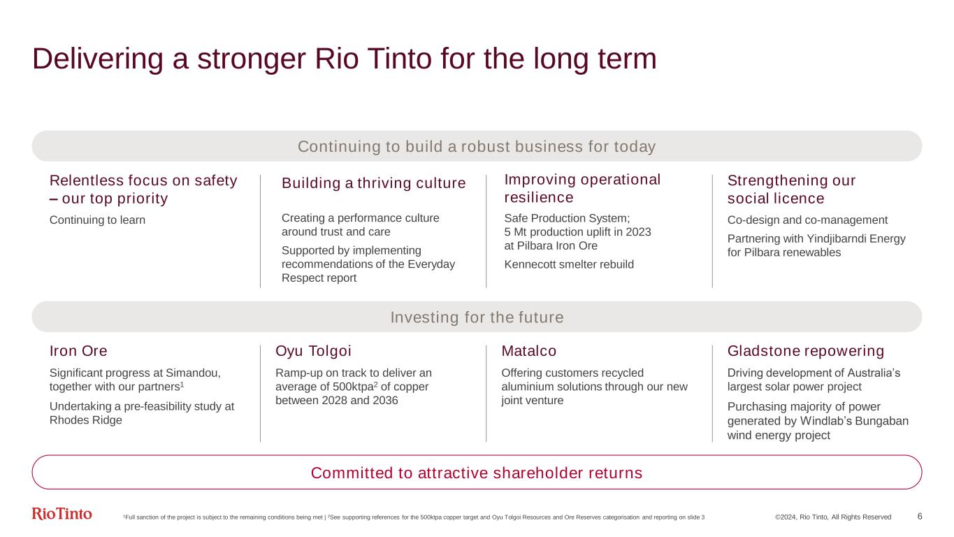 Production (CuEq)2 3% Year-on-year change (2023 versus 2022) ©2024, Rio Tinto, All Rights Reserved 5 Attractive financials1 20% 5-year average3 of 28% 435 US cps Equates to $7.1 bn, payout of 60% in line with 5-year average3 $23.9 bn (42%) 5-year average3 of $26.6 bn (48%) 1All figures relate to 2023 unless noted otherwise | 2Based on long-term consensus pricing | 35-year average relates to 2019 to 2023 Underlying earnings $11.8 bn 5-year average3 of $13.9 bn Free cash flow $7.7 bn 5-year average3 of $10.6 bn Underlying ROCE Underlying EBITDA (margin) Ordinary dividend
