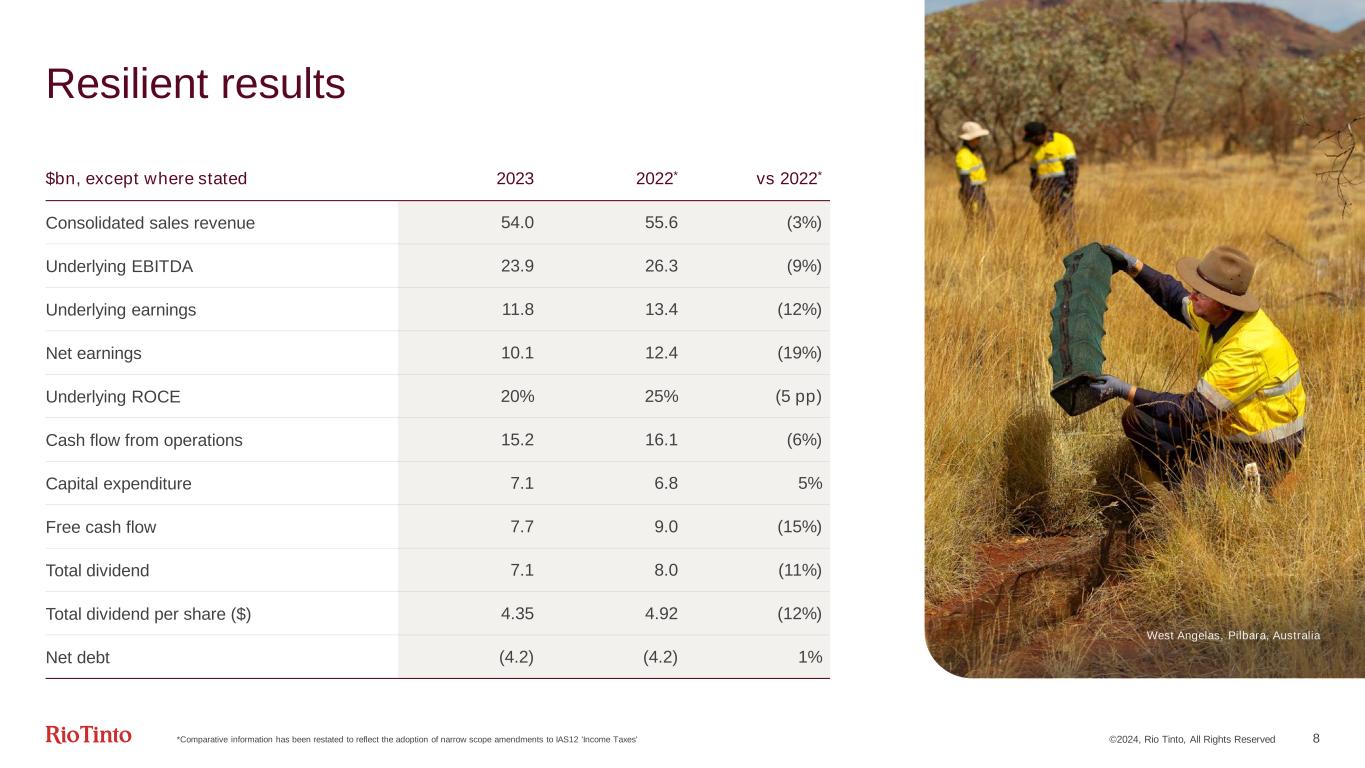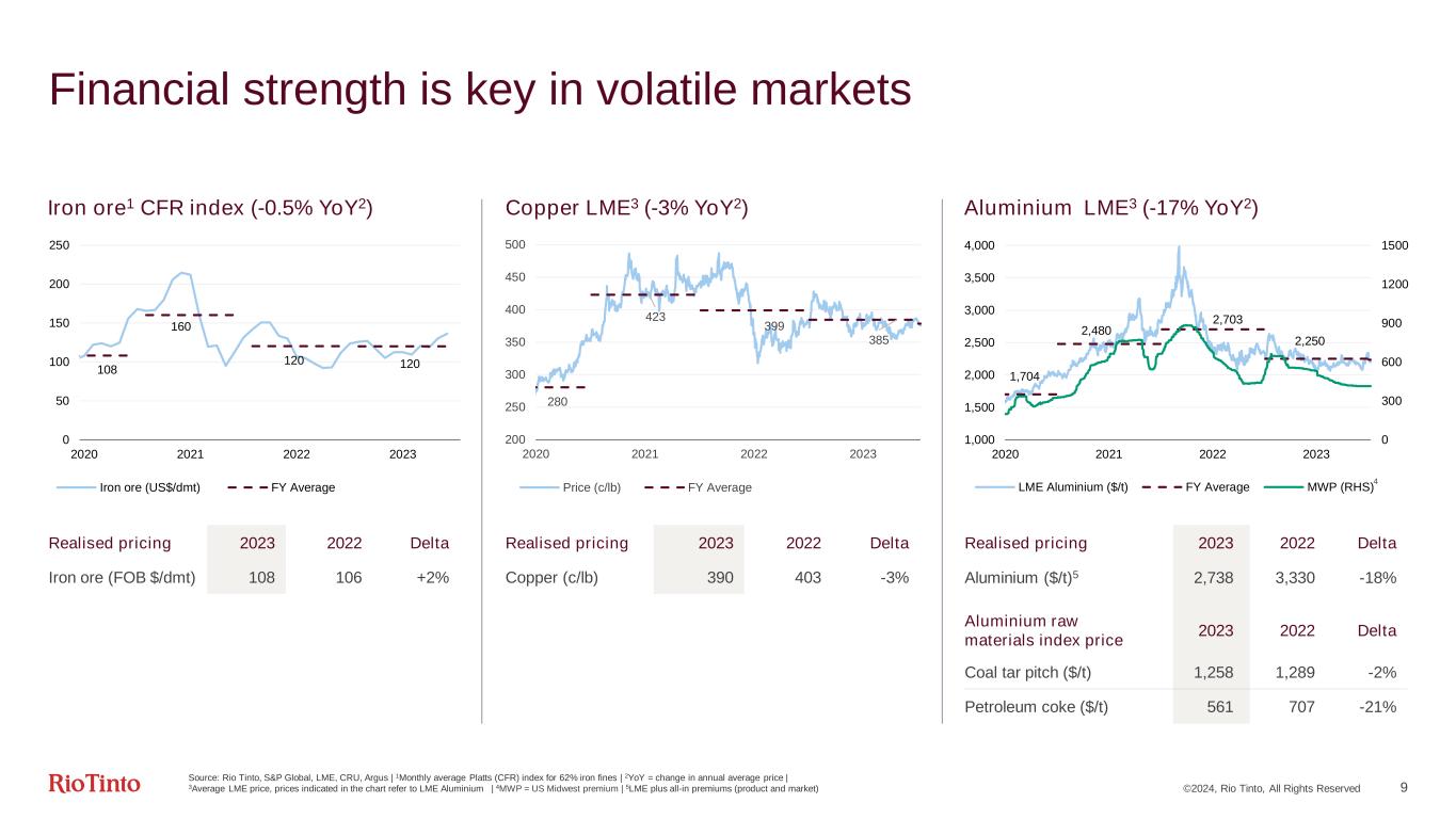 ©2024, Rio Tinto, All Rights Reserved 8 Resilient results *Comparative information has been restated to reflect the adoption of narrow scope amendments to IAS12 'Income Taxes' $bn, except where stated 2023 2022* vs 2022* Consolidated sales revenue 54.0 55.6 (3%) Underlying EBITDA 23.9 26.3 (9%) Underlying earnings 11.8 13.4 (12%) Net earnings 10.1 12.4 (19%) Underlying ROCE 20% 25% (5 pp) Cash flow from operations 15.2 16.1 (6%) Capital expenditure 7.1 6.8 5% Free cash flow 7.7 9.0 (15%) Total dividend 7.1 8.0 (11%) Total dividend per share ($) 4.35 4.92 (12%) Net debt (4.2) (4.2) 1% West Angelas, Pilbara, Australia