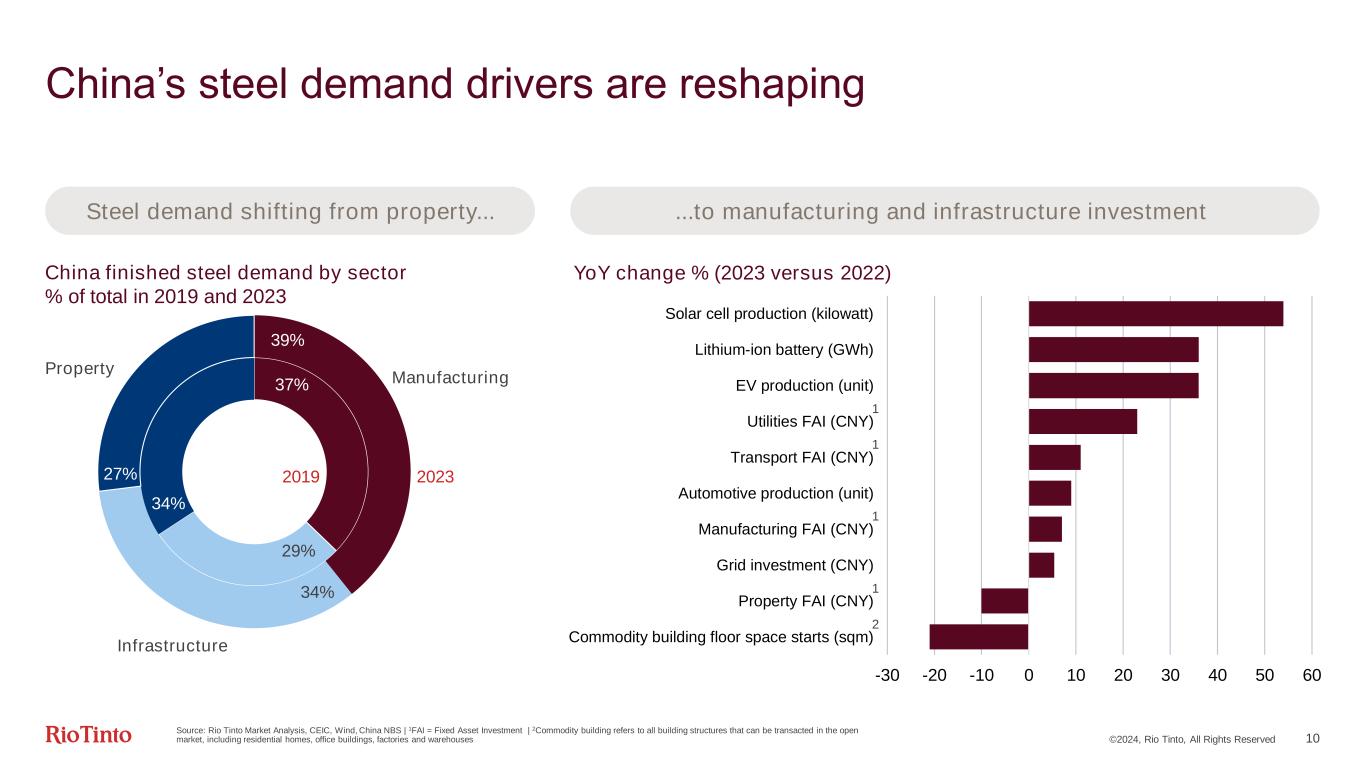 ...to manufacturing and infrastructure investmentSteel demand shifting from property... ©2024, Rio Tinto, All Rights Reserved 10 China’s steel demand drivers are reshaping 37% 29% 34% 34% 27% 2019 2023 39% Manufacturing Infrastructure Property China finished steel demand by sector % of total in 2019 and 2023 -30 -20 -10 0 10 20 30 40 50 60 Commodity building floor space starts (sqm) Property FAI (CNY) Grid investment (CNY) Manufacturing FAI (CNY) Automotive production (unit) Transport FAI (CNY) Utilities FAI (CNY) EV production (unit) Lithium-ion battery (GWh) Solar cell production (kilowatt) YoY change % (2023 versus 2022) 1 1 1 2 1 Source: Rio Tinto Market Analysis, CEIC, Wind, China NBS | 1FAI = Fixed Asset Investment | 2Commodity building refers to all building structures that can be transacted in the open market, including residential homes, office buildings, factories and warehouses