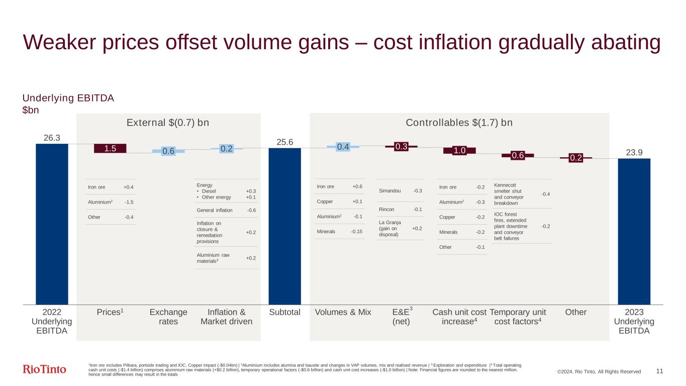 ©2024, Rio Tinto, All Rights Reserved 43 Copper Ramp-up at Oyu Tolgoi underground on track and completion of Kennecott smelter rebuild Gain on land swap at Kennecott recorded in 2022 2,565 2,607 1,904 550 225 2022 underlying EBITDA 46 Prices 33 Exchange 29 Energy 66 Inflation Flexed EBITDA 72 Volumes & Mix Cash costs Other1 2023 underlying EBITDA Higher volumes with Oyu Tolgoi underground ramp-up partially offset by Kennecott smelter rebuild and conveyor outage Fixed cost inefficiencies with lower Kennecott volumes Underlying EBITDA 2023 vs 2022 $m 1Other includes Non-cash costs and Exploration & Evaluation expense