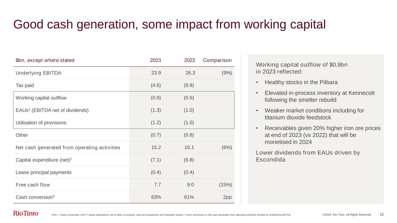 ©2024, Rio Tinto, All Rights Reserved 11 Weaker prices offset volume gains – cost inflation gradually abating Underlying EBITDA $bn 26.3 25.6 23.91.5 2022 Underlying EBITDA Prices1 0.6 Exchange rates 0.2 Inflation & Market driven Subtotal 0.4 Volumes & Mix 0.3 E&E (net) 1.0 Cash unit cost increase4 0.6 Temporary unit cost factors4 0.2 Other 2023 Underlying EBITDA External $(0.7) bn Controllables $(1.7) bn Iron ore +0.4 Aluminium2 -1.5 Other -0.4 Energy • Diesel • Other energy +0.3 +0.1 General inflation -0.6 Inflation on closure & remediation provisions +0.2 Aluminium raw materials3 +0.2 Kennecott smelter shut and conveyor breakdown -0.4 IOC forest fires, extended plant downtime and conveyor belt failures -0.2 Simandou -0.3 Rincon -0.1 La Granja (gain on disposal) +0.2 1Iron ore includes Pilbara, portside trading and IOC, Copper impact (-$0.04bn) | 2Aluminium includes alumina and bauxite and changes in VAP volumes, mix and realised revenue | 3 Exploration and expenditure |4 Total operating cash unit costs (-$1.4 billion) comprises aluminium raw materials (+$0.2 billion), temporary operational factors (-$0.6 billion) and cash unit cost increases (-$1.0 billion) | Note: Financial figures are rounded to the nearest million, hence small differences may result in the totals Iron ore +0.6 Copper +0.1 Aluminium2 -0.1 Minerals -0.15 Iron ore -0.2 Aluminium2 -0.3 Copper -0.2 Minerals -0.2 Other -0.1 3