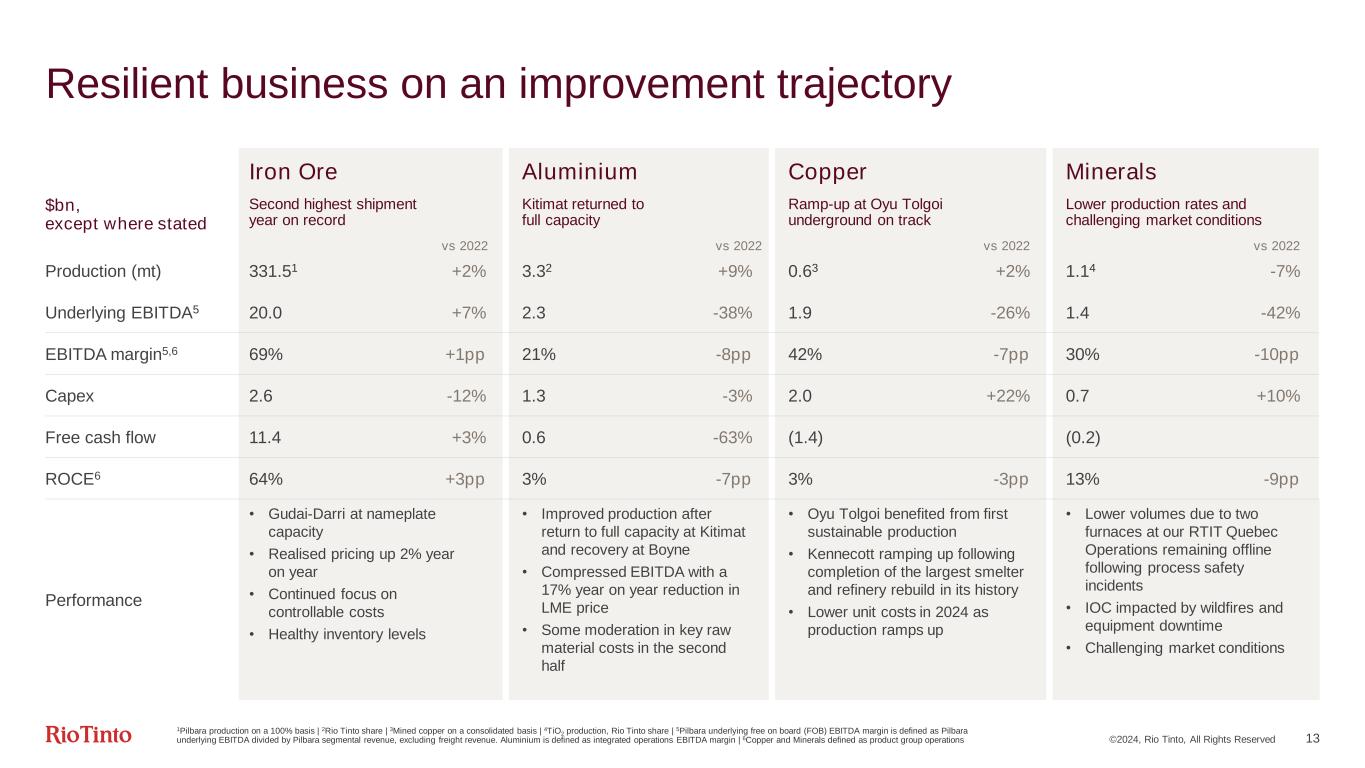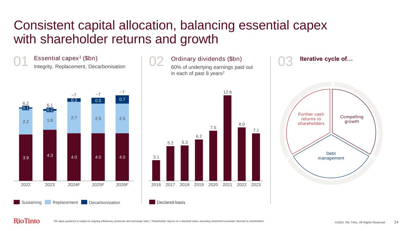 ©2024, Rio Tinto, All Rights Reserved 13 Resilient business on an improvement trajectory Iron Ore Aluminium Copper Minerals $bn, except where stated Second highest shipment year on record Kitimat returned to full capacity Ramp-up at Oyu Tolgoi underground on track Lower production rates and challenging market conditions Production (mt) 331.51 +2% 3.32 +9% 0.63 +2% 1.14 -7% Underlying EBITDA5 20.0 +7% 2.3 -38% 1.9 -26% 1.4 -42% EBITDA margin5,6 69% +1pp 21% -8pp 42% -7pp 30% -10pp Capex 2.6 -12% 1.3 -3% 2.0 +22% 0.7 +10% Free cash flow 11.4 +3% 0.6 -63% (1.4) (0.2) ROCE6 64% +3pp 3% -7pp 3% -3pp 13% -9pp Performance • Gudai-Darri at nameplate capacity • Realised pricing up 2% year on year • Continued focus on controllable costs • Healthy inventory levels • Improved production after return to full capacity at Kitimat and recovery at Boyne • Compressed EBITDA with a 17% year on year reduction in LME price • Some moderation in key raw material costs in the second half • Oyu Tolgoi benefited from first sustainable production • Kennecott ramping up following completion of the largest smelter and refinery rebuild in its history • Lower unit costs in 2024 as production ramps up • Lower volumes due to two furnaces at our RTIT Quebec Operations remaining offline following process safety incidents • IOC impacted by wildfires and equipment downtime • Challenging market conditions vs 2022 vs 2022 vs 2022 1Pilbara production on a 100% basis | 2Rio Tinto share | 3Mined copper on a consolidated basis | 4TiO2 production, Rio Tinto share | 5Pilbara underlying free on board (FOB) EBITDA margin is defined as Pilbara underlying EBITDA divided by Pilbara segmental revenue, excluding freight revenue. Aluminium is defined as integrated operations EBITDA margin | 6Copper and Minerals defined as product group operations vs 2022