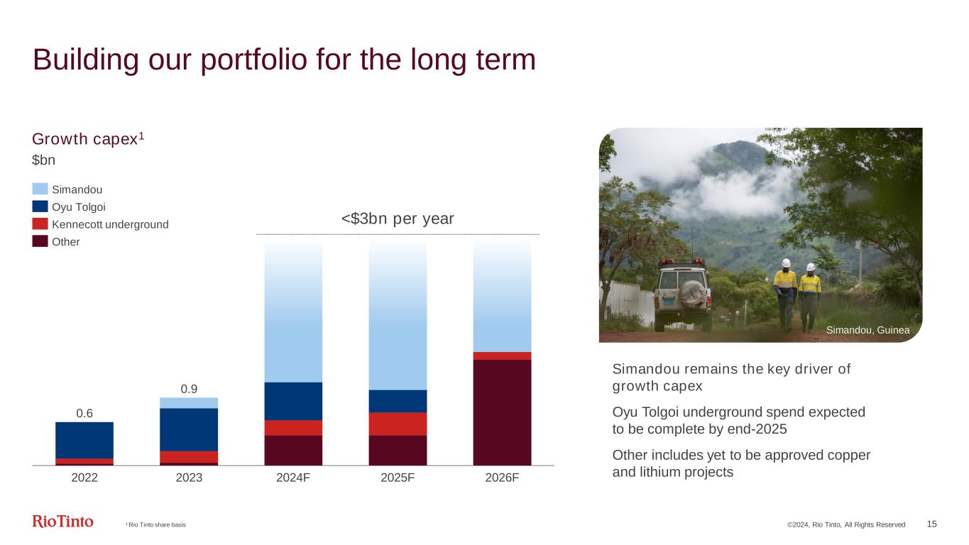 ©2024, Rio Tinto, All Rights Reserved 14 Consistent capital allocation, balancing essential capex with shareholder returns and growth Essential capex1 ($bn) Integrity, Replacement, Decarbonisation01 Ordinary dividends ($bn) 60% of underlying earnings paid out in each of past 8 years2 02 Iterative cycle of…03 Declared basis Further cash returns to shareholders Compelling growth Debt management3.9 4.3 4.0 4.0 4.0 2.2 1.6 2.7 2.5 2.5 0.3 0.5 0.7 0.1 2022 0.2 2023 2024F 2025F 2026F 6.2 6.1 ~7 ~7 ~7 Sustaining Replacement Decarbonisation 3.1 5.2 5.3 6.2 7.5 12.8 8.0 7.1 2016 2017 2018 2019 2020 2021 2022 2023 1All capex guidance is subject to ongoing inflationary pressures and exchange rates | 2Shareholder returns on a declared basis, excluding divestment proceeds returned to shareholders
