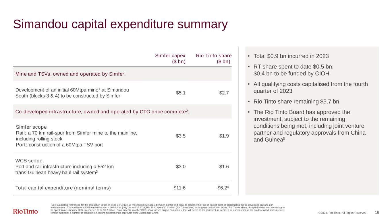 ©2024, Rio Tinto, All Rights Reserved 15 Building our portfolio for the long term Growth capex1 $bn Simandou remains the key driver of growth capex Oyu Tolgoi underground spend expected to be complete by end-2025 Other includes yet to be approved copper and lithium projects <$3bn per year 2022 2023 2024F 2025F 2026F 0.6 0.9 Simandou Oyu Tolgoi Kennecott underground Other 1 Rio Tinto share basis Simandou, Guinea