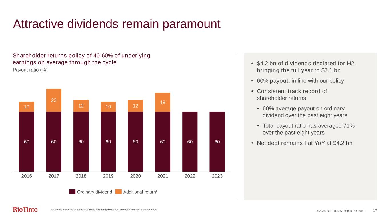 ©2024, Rio Tinto, All Rights Reserved 16 Simandou capital expenditure summary Simfer capex ($ bn) Rio Tinto share ($ bn) Mine and TSVs, owned and operated by Simfer: Development of an initial 60Mtpa mine1 at Simandou South (blocks 3 & 4) to be constructed by Simfer $5.1 $2.7 Co-developed infrastructure, owned and operated by CTG once complete2: Simfer scope Rail: a 70 km rail-spur from Simfer mine to the mainline, including rolling stock Port: construction of a 60Mtpa TSV port $3.5 $1.9 WCS scope Port and rail infrastructure including a 552 km trans-Guinean heavy haul rail system3 $3.0 $1.6 Total capital expenditure (nominal terms) $11.6 $6.24 1See supporting references for the production target on slide 3 | 2A true-up mechanism will apply between Simfer and WCS to equalise their out of pocket costs of constructing the co-developed rail and port infrastructure | 3Comprised of a 536km mainline and a 16km spur | 4By the end of 2023, Rio Tinto spent $0.5 billion (Rio Tinto share) to progress critical path works. Rio Tinto’s share of capital investment remaining to be spent from 1 January 2024 is expected to be $5.7 billion | 5Investments into the WCS infrastructure project companies, that will serve as the joint venture vehicles for construction of the co-developed infrastructure, remain subject to a number of conditions including governmental approvals from Guinea and China • Total $0.9 bn incurred in 2023 • RT share spent to date $0.5 bn; $0.4 bn to be funded by CIOH • All qualifying costs capitalised from the fourth quarter of 2023 • Rio Tinto share remaining $5.7 bn • The Rio Tinto Board has approved the investment, subject to the remaining conditions being met, including joint venture partner and regulatory approvals from China and Guinea5